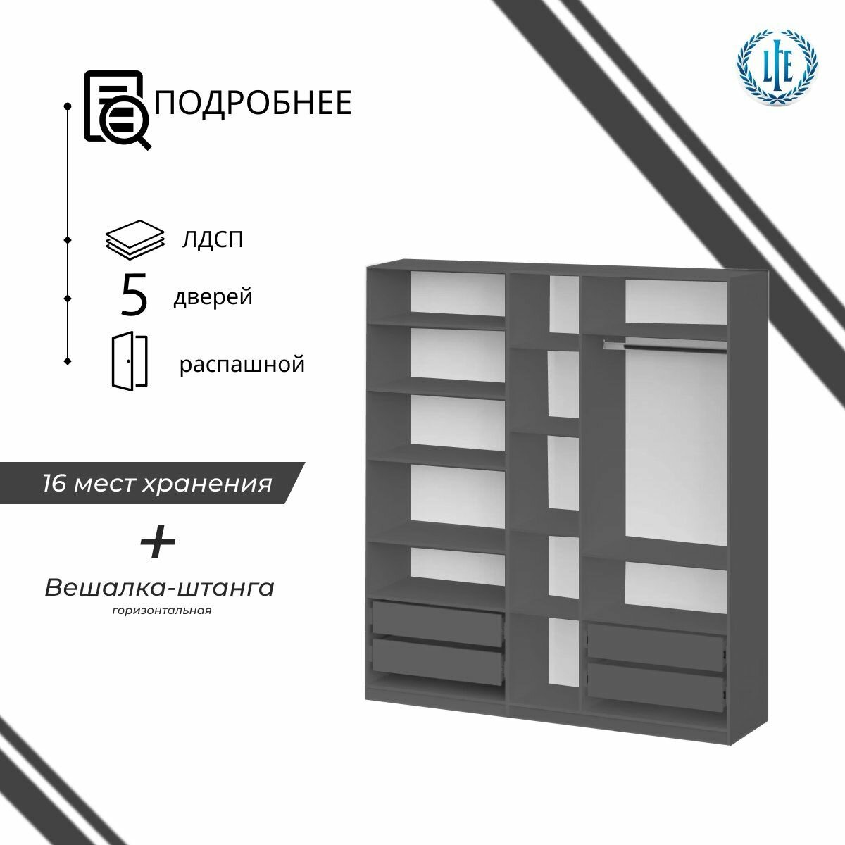 10 цен на Шкаф распашной для одежды Лувр серый графит, 5-ти дверный, модульный, с доводчиками, 12-ю полками, штангой, 4-мя выдвижными ящиками и антресолью, 200.2х50.6х260 см