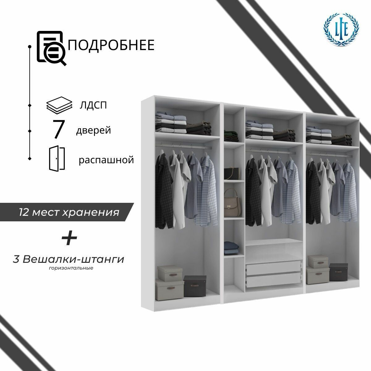 10 цен на Шкаф распашной Лувр белый/белый глянец, 7-ми дверный, модульный, с доводчиками, выдвижными ящиками, 9-ю полками и 3-мя штангами, 280.3х50.6х221.6 см