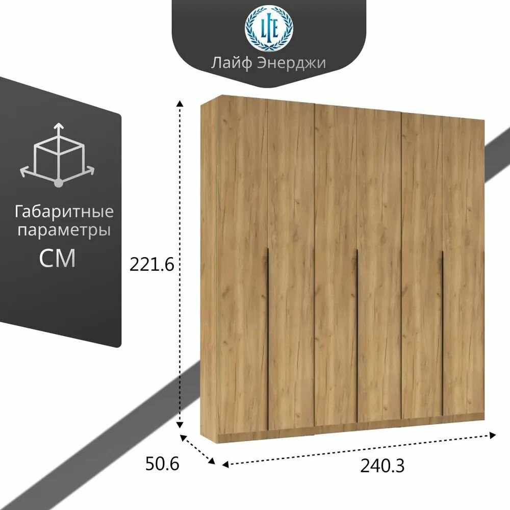Шкаф распашной для одежды Лувр дуб золотой, 6-ти дверный, модульный, с доводчиками, полками и 3-мя штангами, 240.2х50.6х221.6 см 32 751 ₽