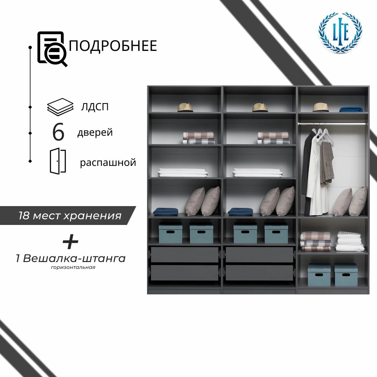 Шкаф распашной для одежды Лувр серый графит, 6-ти дверный, модульный, с доводчиками, 14-ю полками, штангой и 2-мя выдвижными ящиками, 240.2х50.6х221,6 см 39 100 ₽
