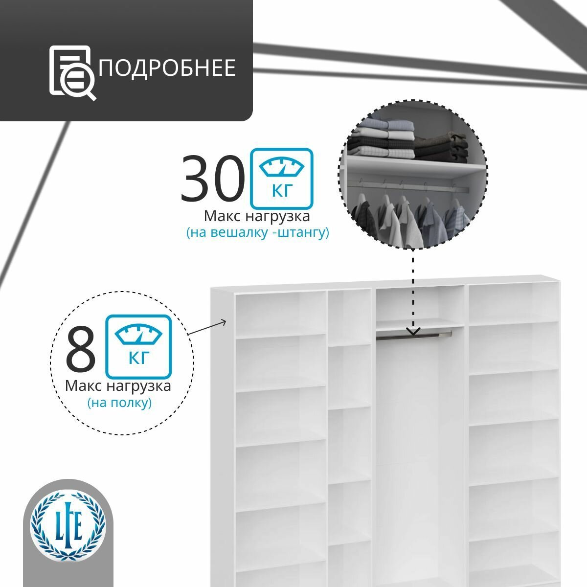 Шкаф для одежды распашной Лувр белый текстурный, 6-ти дверный, модульный, с доводчиками, 9-ю полками и 3-мя штангами, 240.2х50.6х221.6 см 37 750 ₽