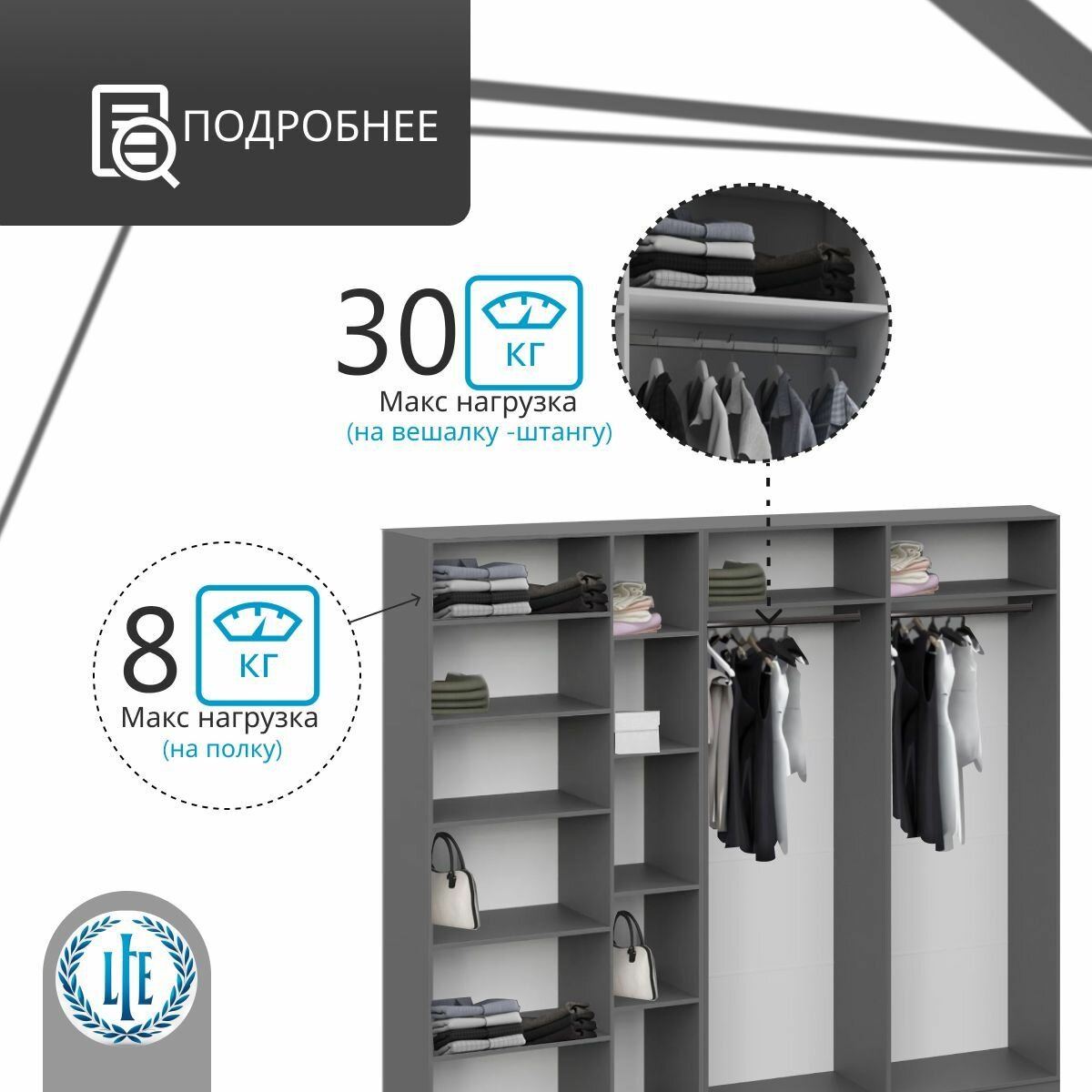 Шкаф распашной для одежды Лувр серый графит, 6-ти дверный, модульный, с доводчиками, 14-ю полками и штангой, 240.2х50.6х221,6 см 36 222 ₽