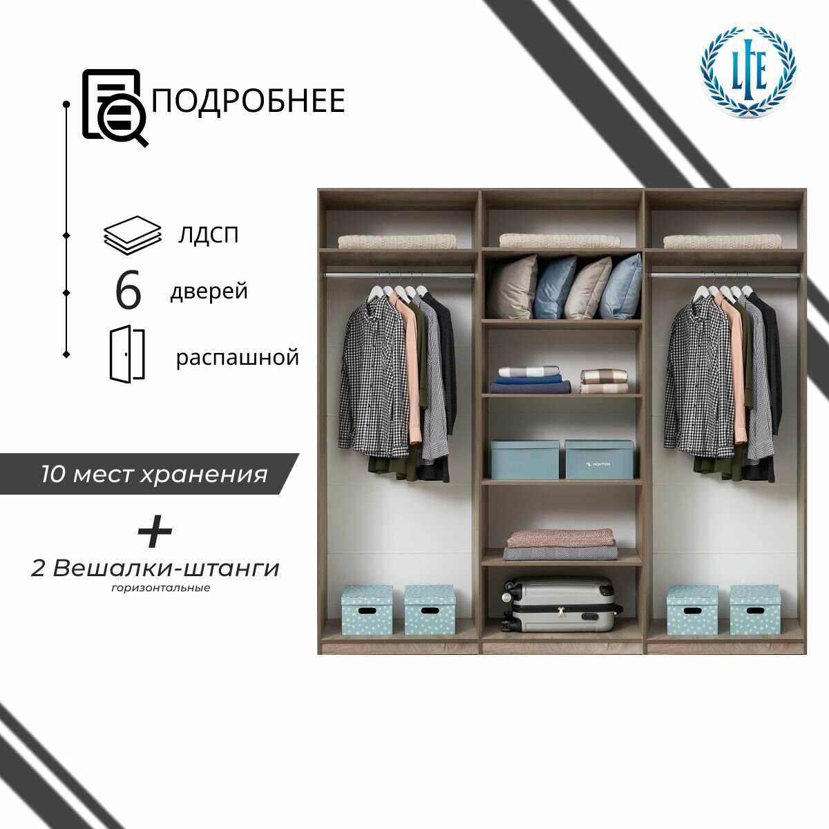 10 цен на Шкаф распашной для одежды Лувр эндгрейн/меланж(капучино), 6-ти дверный, модульный, с доводчиками, 7-ю полками и 2-мя штангами, 240.2х50.6х221.6 см