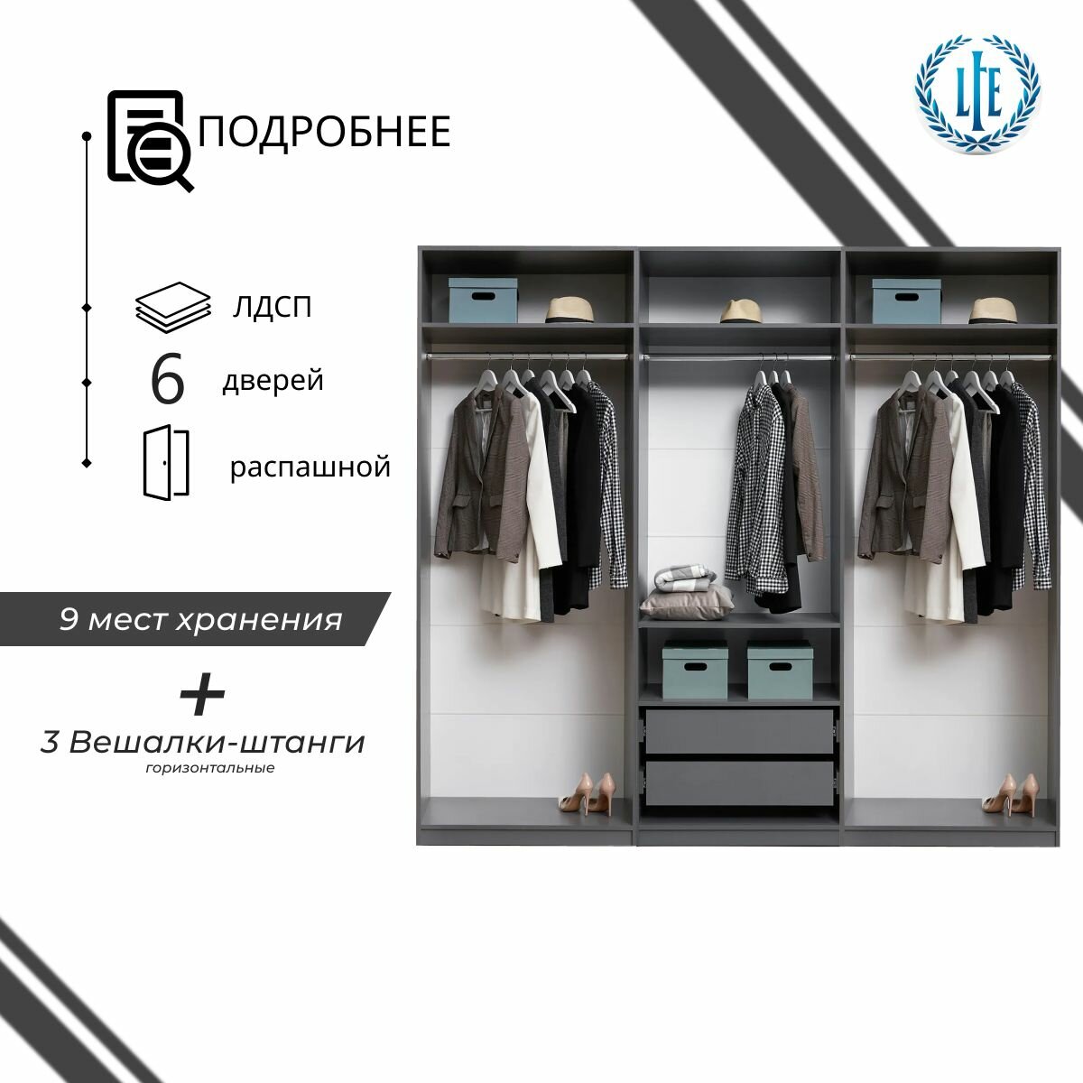 10 цен на Шкаф для одежды распашной Лувр графит серый, 6-ти дверный, модульный, с доводчиками, 2-мя ящиками, 5-ю полками и 3-мя штангами, 240.2х50.6х221.6 см