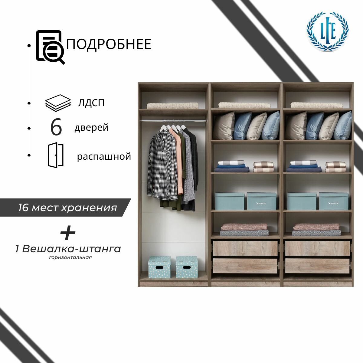 Угловой шкаф распашной для одежды модульный Лувр эндгрейн/меланж(капучино), модульный, с 4-мя выдвижными ящиками и 15-ю полками 48 942 ₽