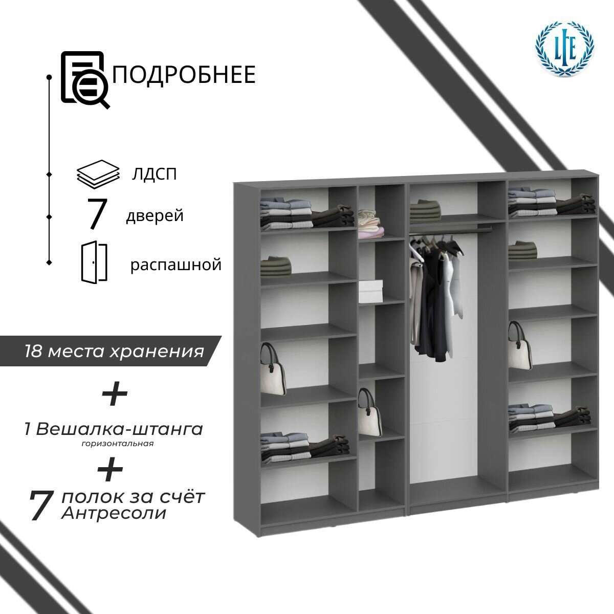 10 цен на Шкаф для одежды распашной Лувр серый графит, 7-ми дверный, модульный, с доводчиками, 15-ю полками, штангой и антресолью, 280.3х50.6х260 см
