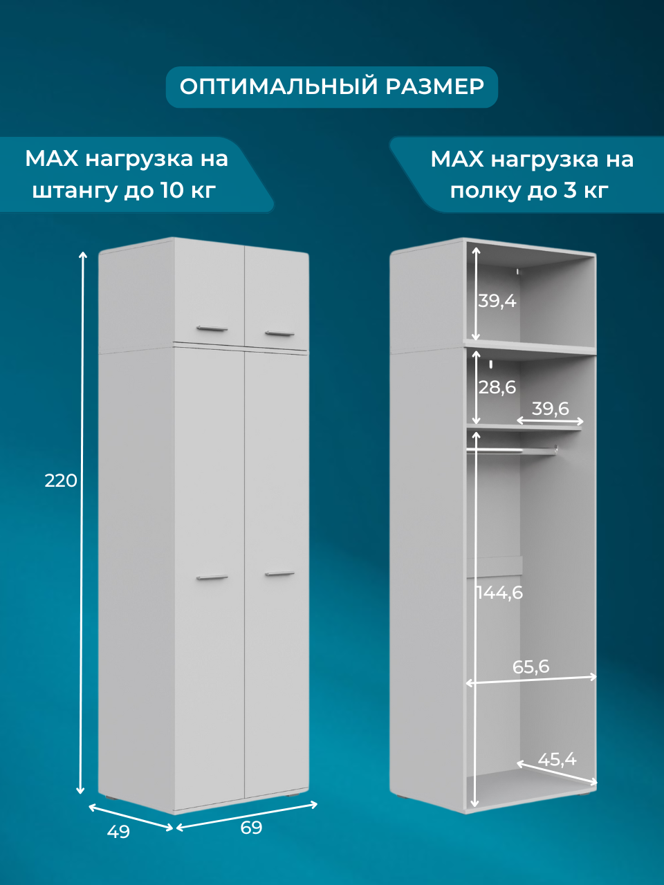Шкаф для одежды с антресолью, FUN ШК-1, Белый, 69х220х50,6 см (ШхВхГ) информация: