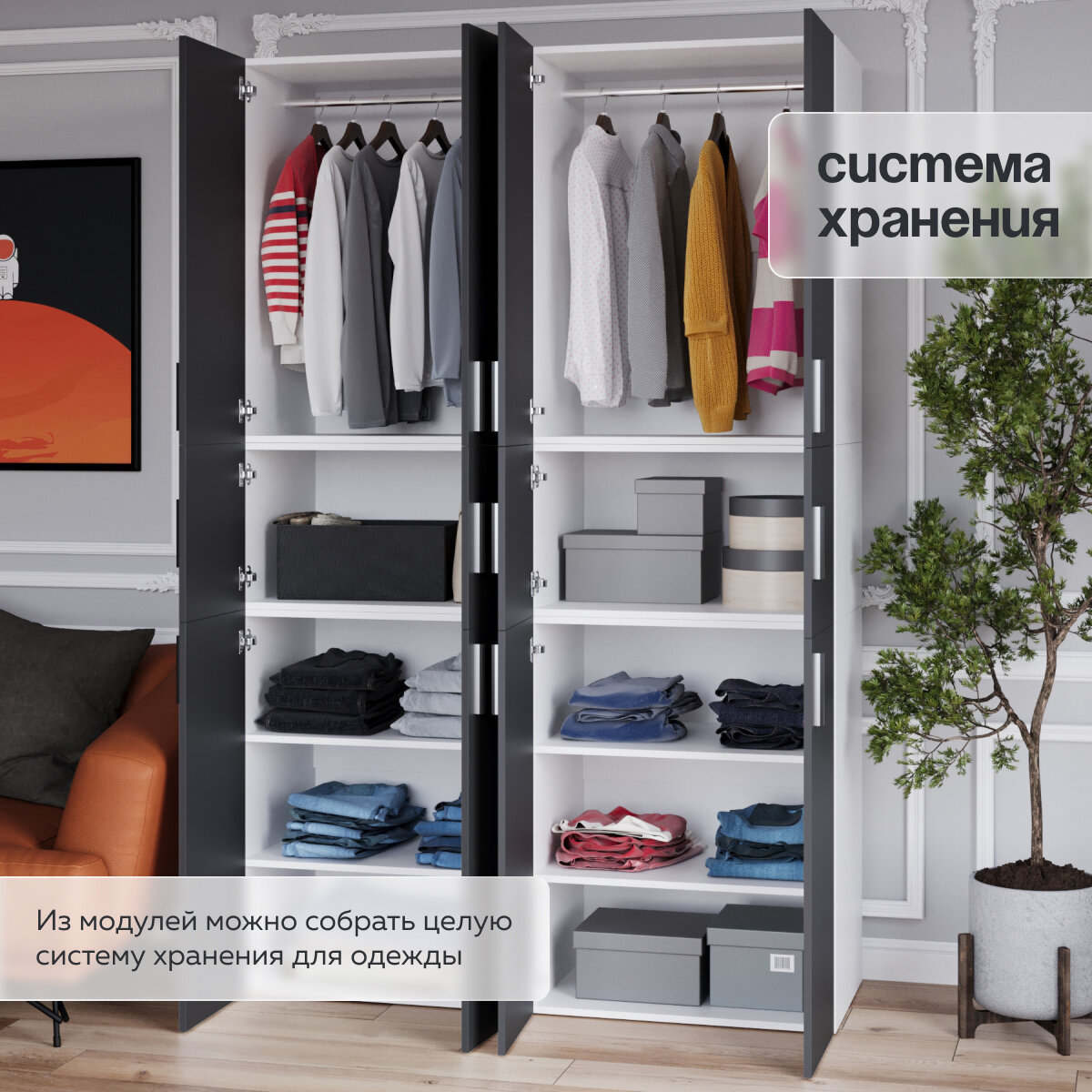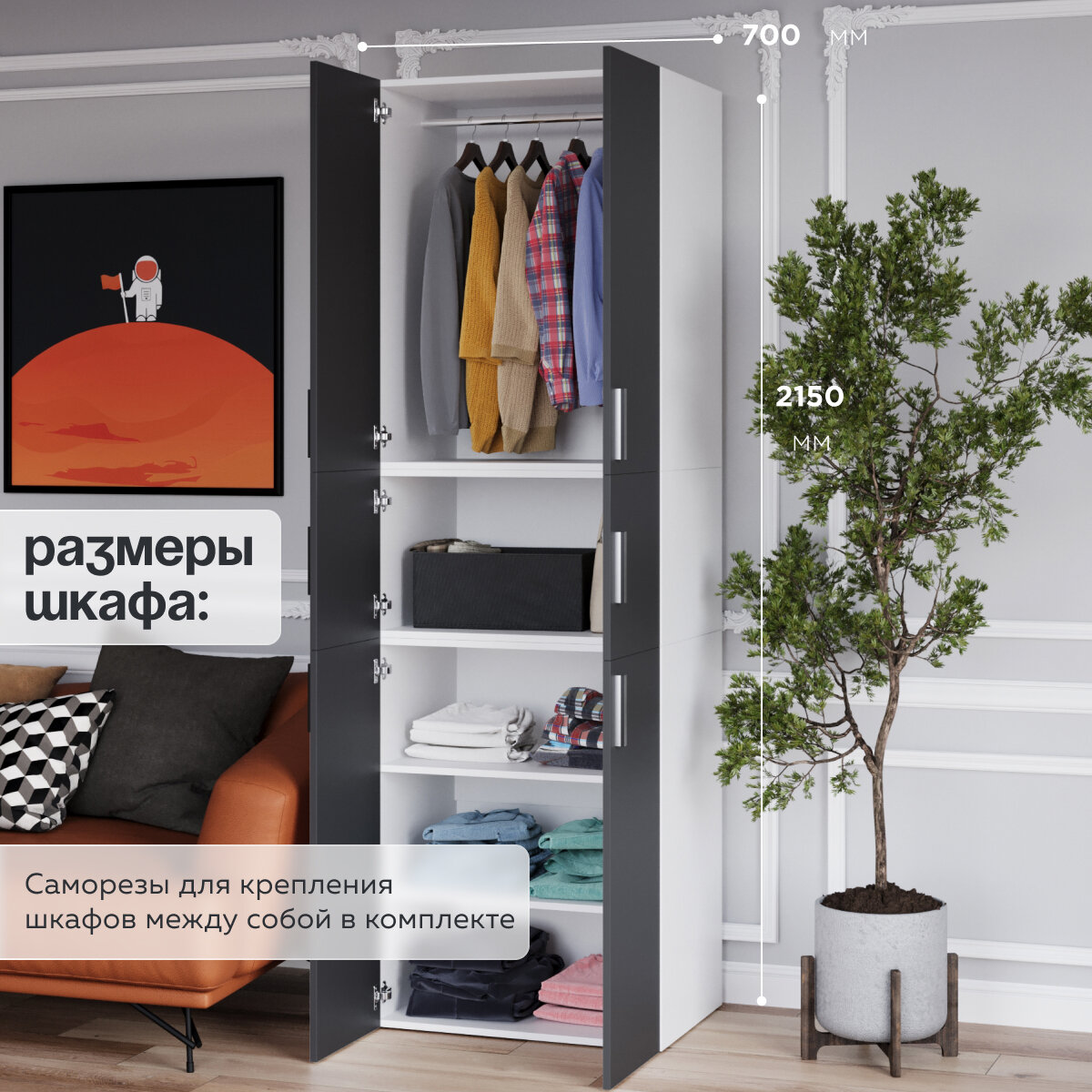 Отзывы на Шкаф для одежды распашной модульный «Twin» 215х45х70; цвет серый; 3 секции