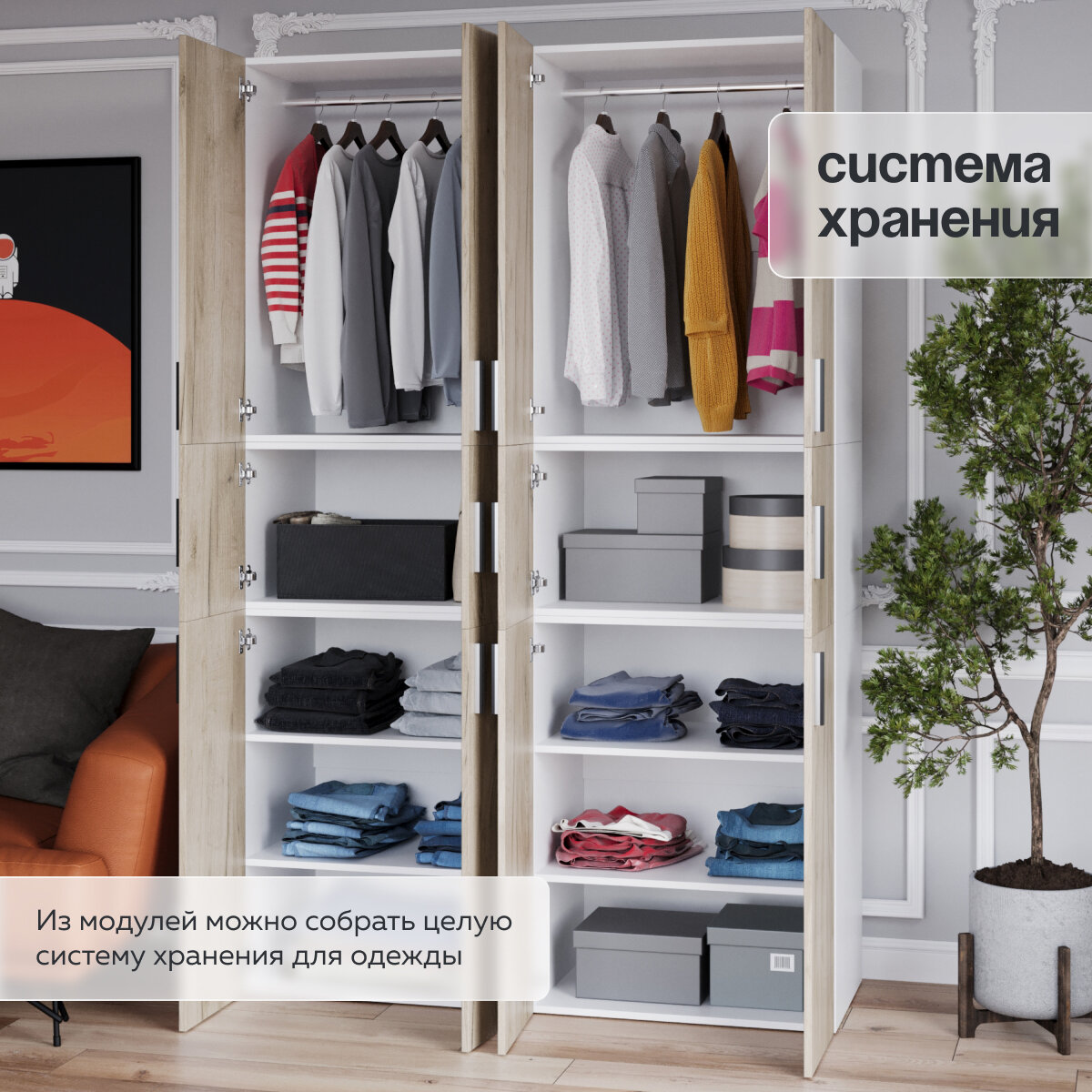 Отзывы на Шкаф для одежды распашной модульный «Twin» 215х45х70; цвет дуб; 3 секции