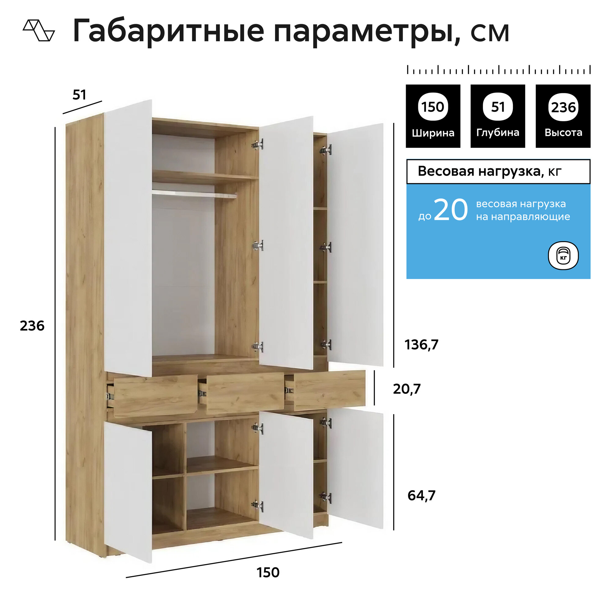 Шкаф для одежды с ящиками Нонтон Бостон, дуб крафт золотой / белый глянец, 150 см информация: