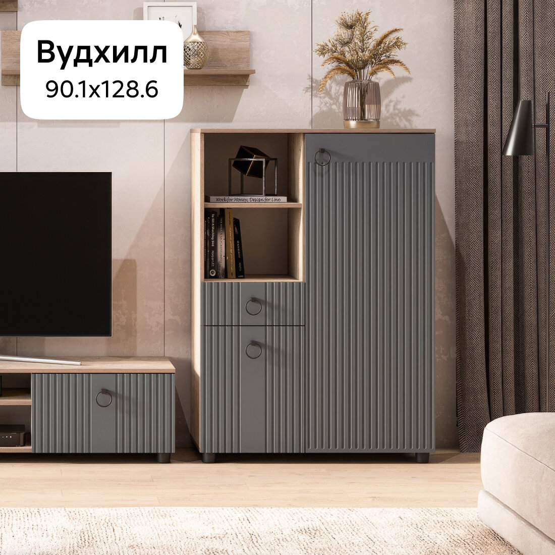Шкаф для одежды распашной с полками и ящиком Нонтон Вудхилл, эндгрейн / графит, 90 см информация: