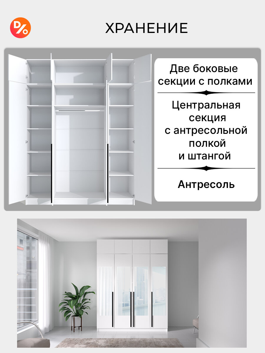 10 цен на Шкаф распашной Бастион 4-х дверный с антресолью и 4-мя зеркалами 2.0 м (белый древесный)