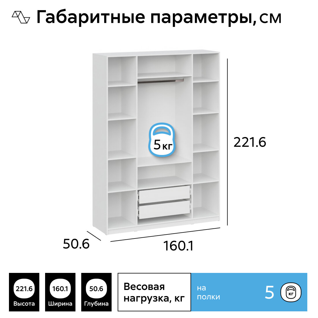 Шкаф для одежды распашной Нонтон Луас, 160 см, 11 полок, 1 штанга, 2 ящика, белый глянец информация: