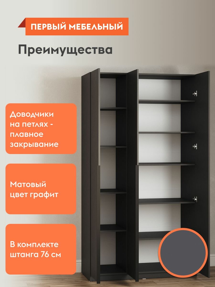 Шкаф распашной для одежды и хранения вещей Арно с полками, с доводчиками, 120.1х50.6х221.6 см, Графит информация: