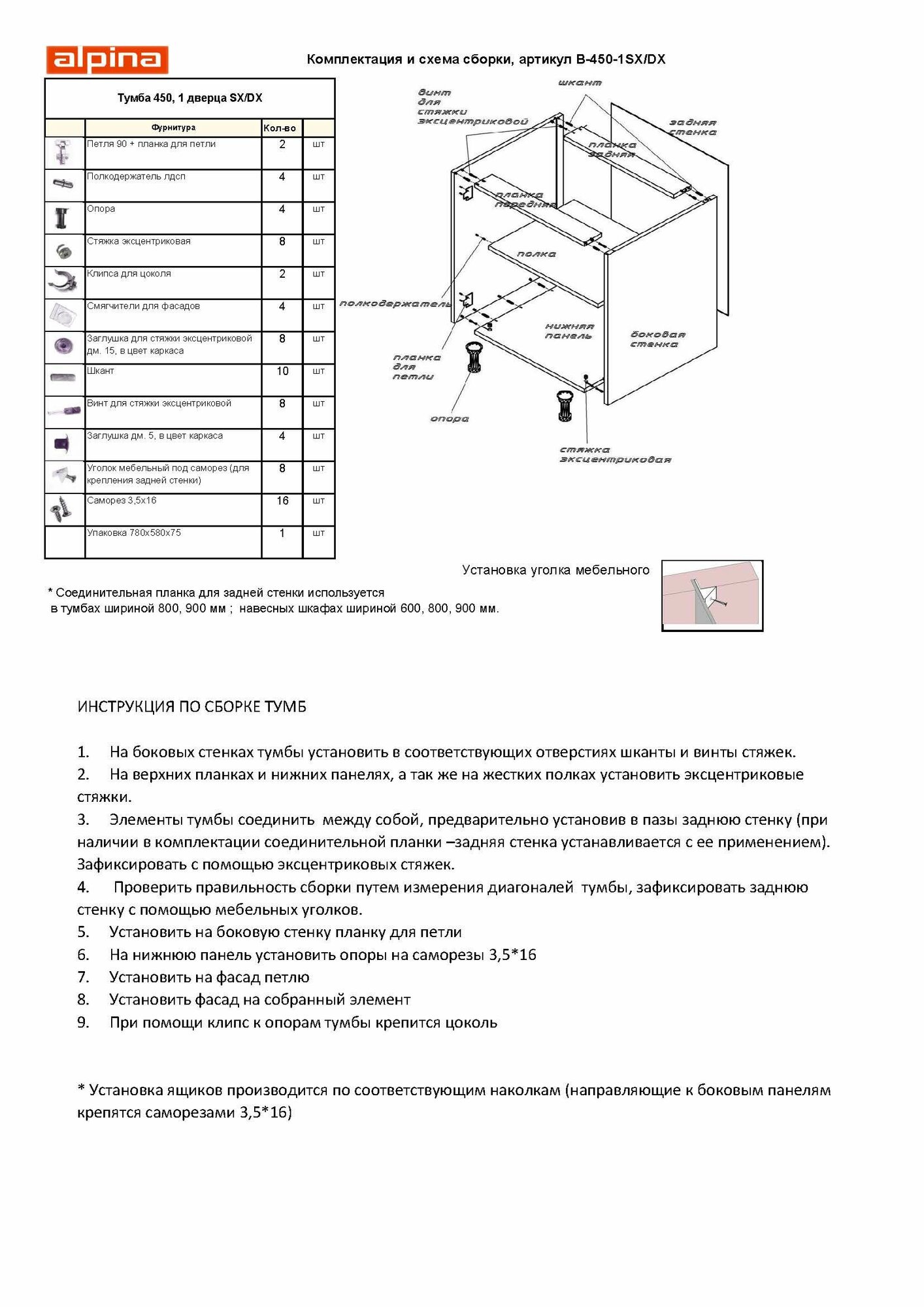 Отзывы на B-450-1SX/DX, Каркас тумбы напольной 1 дверца Ш450мм, В720мм, лев./прав. Белый