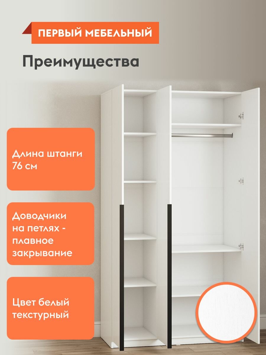 Шкаф распашной для одежды и хранения вещей Арно с полками, со штангой, с доводчиками, 120.1х50.6х221.6 см, Белый текстурный информация: