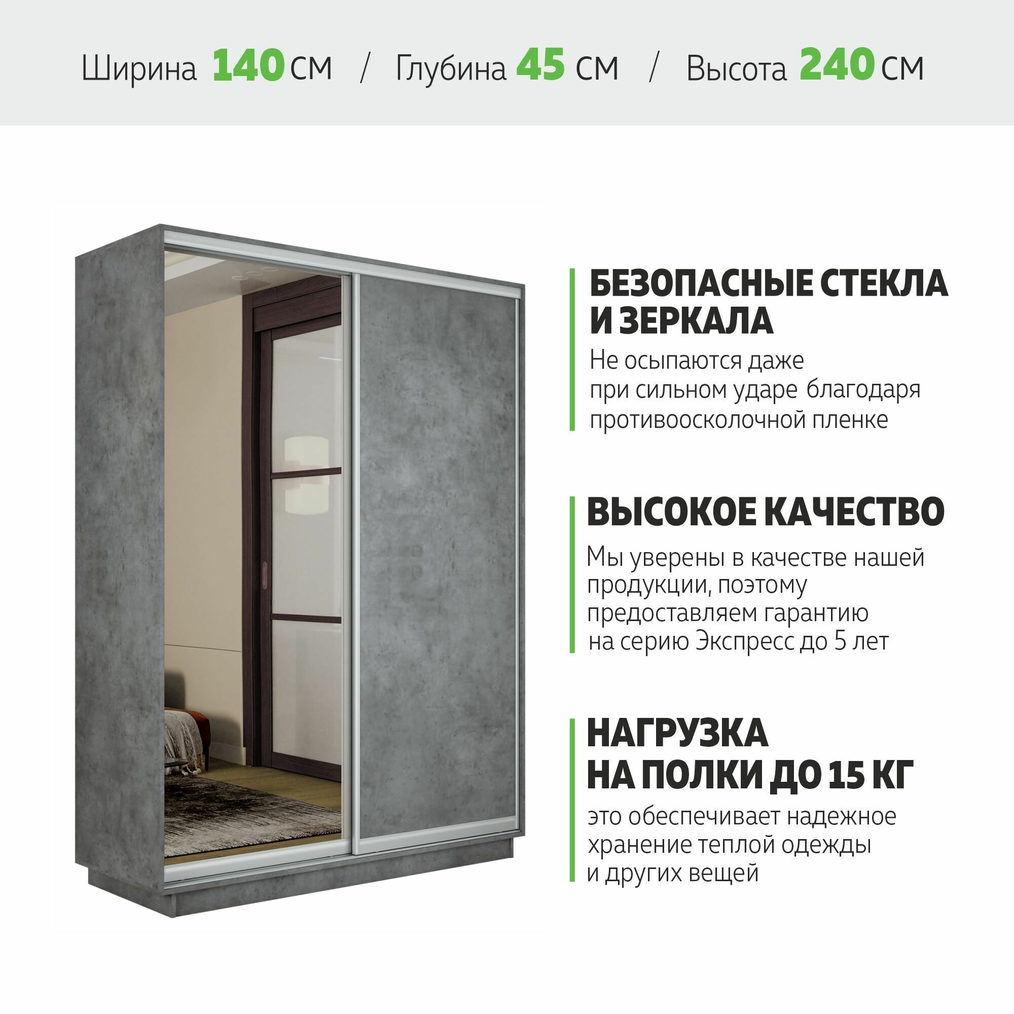 Отзывы на Шкаф-купе Экспресс 2-х дверный, ДСП/Зеркало, 140х45х240, Мебельная компания Е1, Бетон