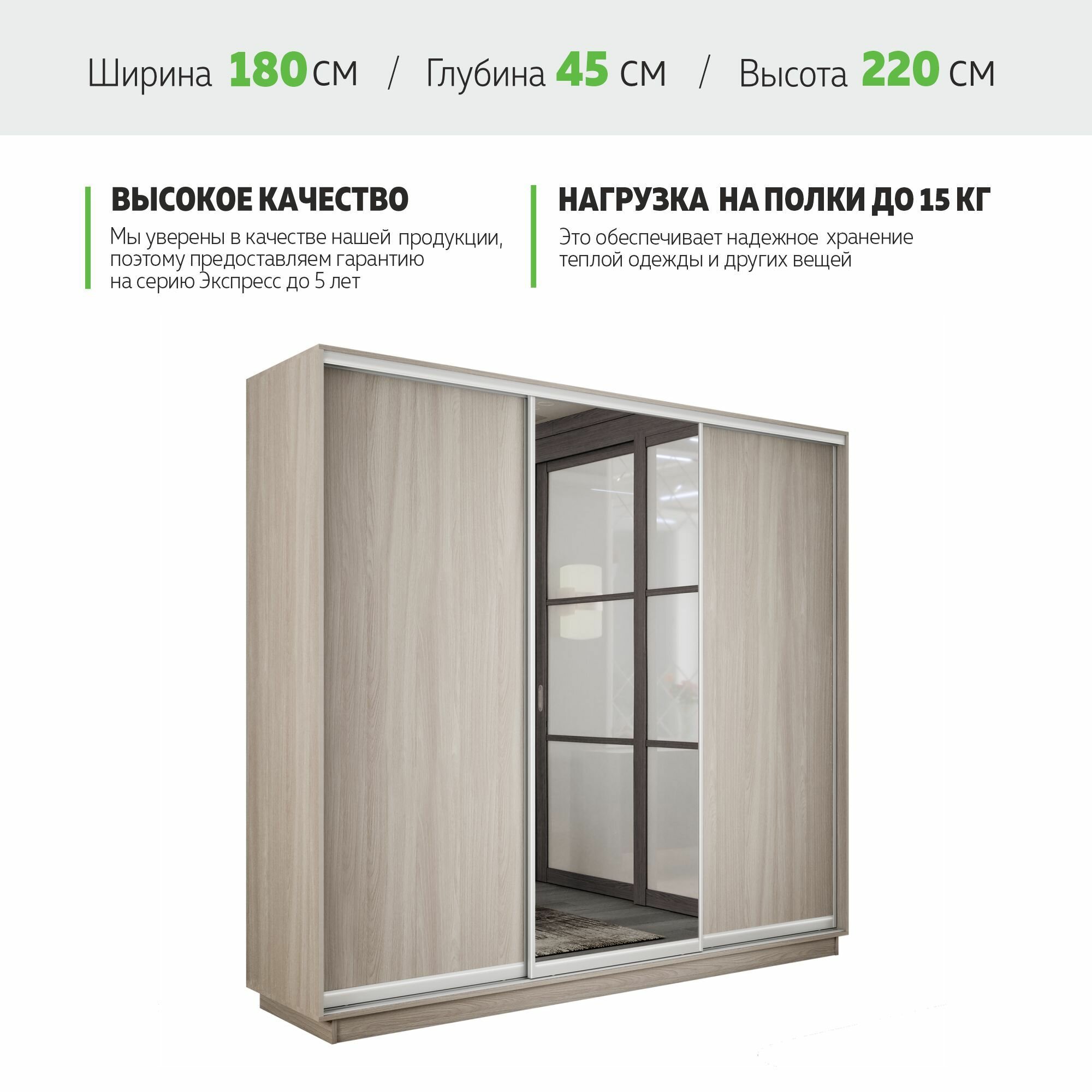 Шкаф-купе Экспресс 3-х дверный, ДСП/Зеркало/ДСП, 180х45х220, Мебельная компания Е1, Ясень Шимо светлый информация: