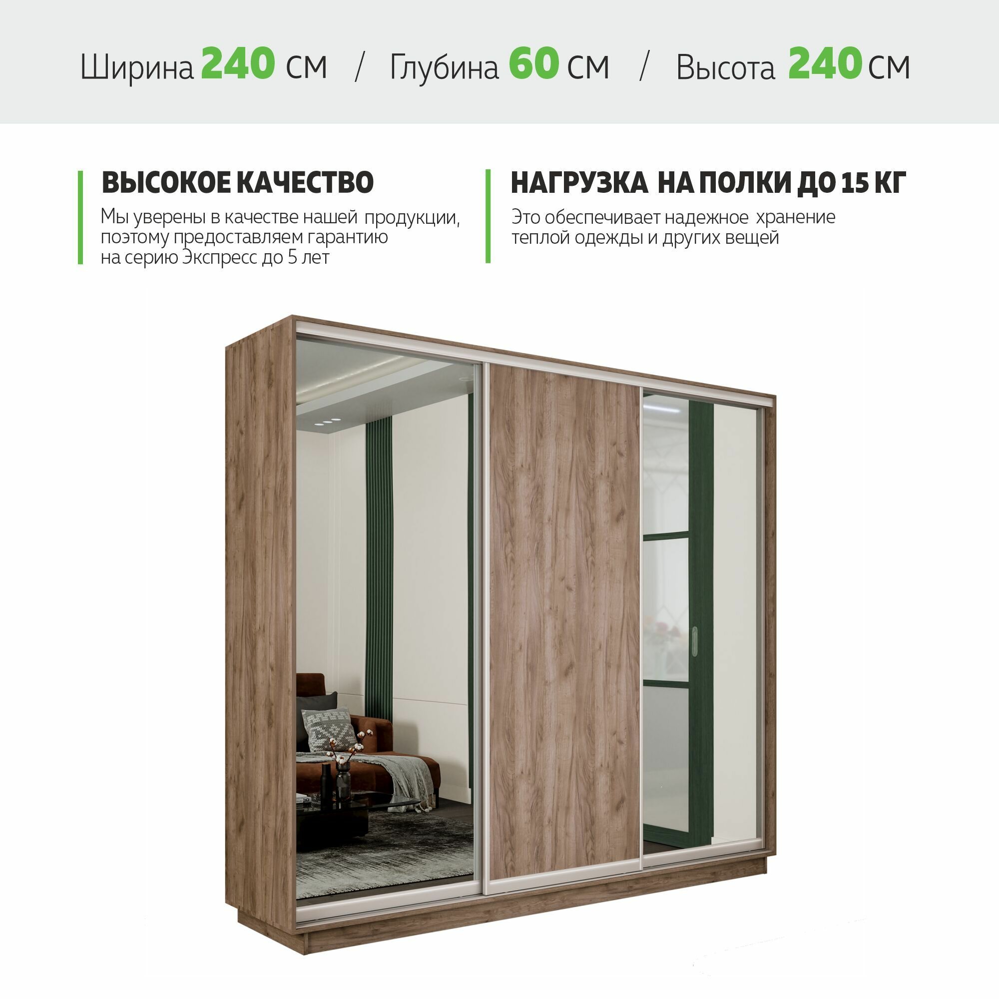 Шкаф-купе Экспресс 3-х дверный, Зеркало/ДСП/Зеркало, 240х60х240, Мебельная компания Е1, Дуб табачный информация: