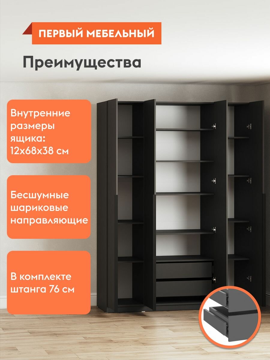 Шкаф распашной для одежды Арно с полками, с ящиками, с доводчиками, 160.1х50.6х221.6 см, Графит информация: