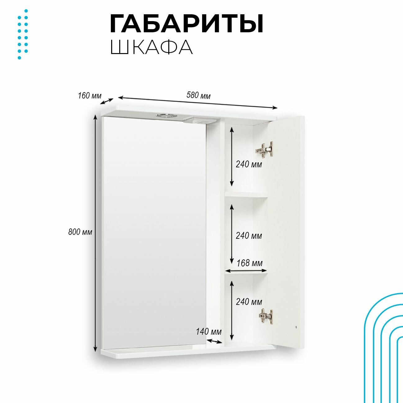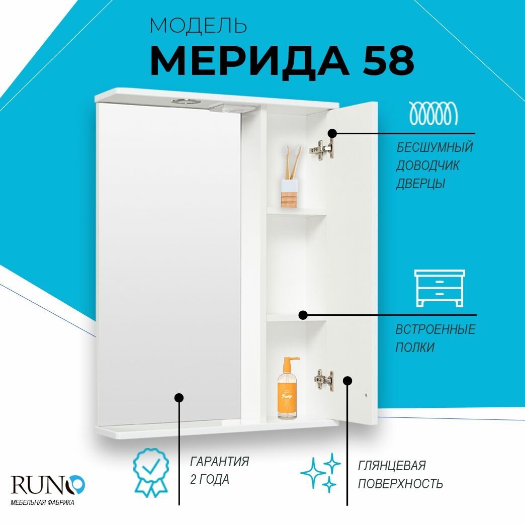 Шкаф в ванную с зеркалом Runo Мерида 58, правый, с подсветкой информация:
