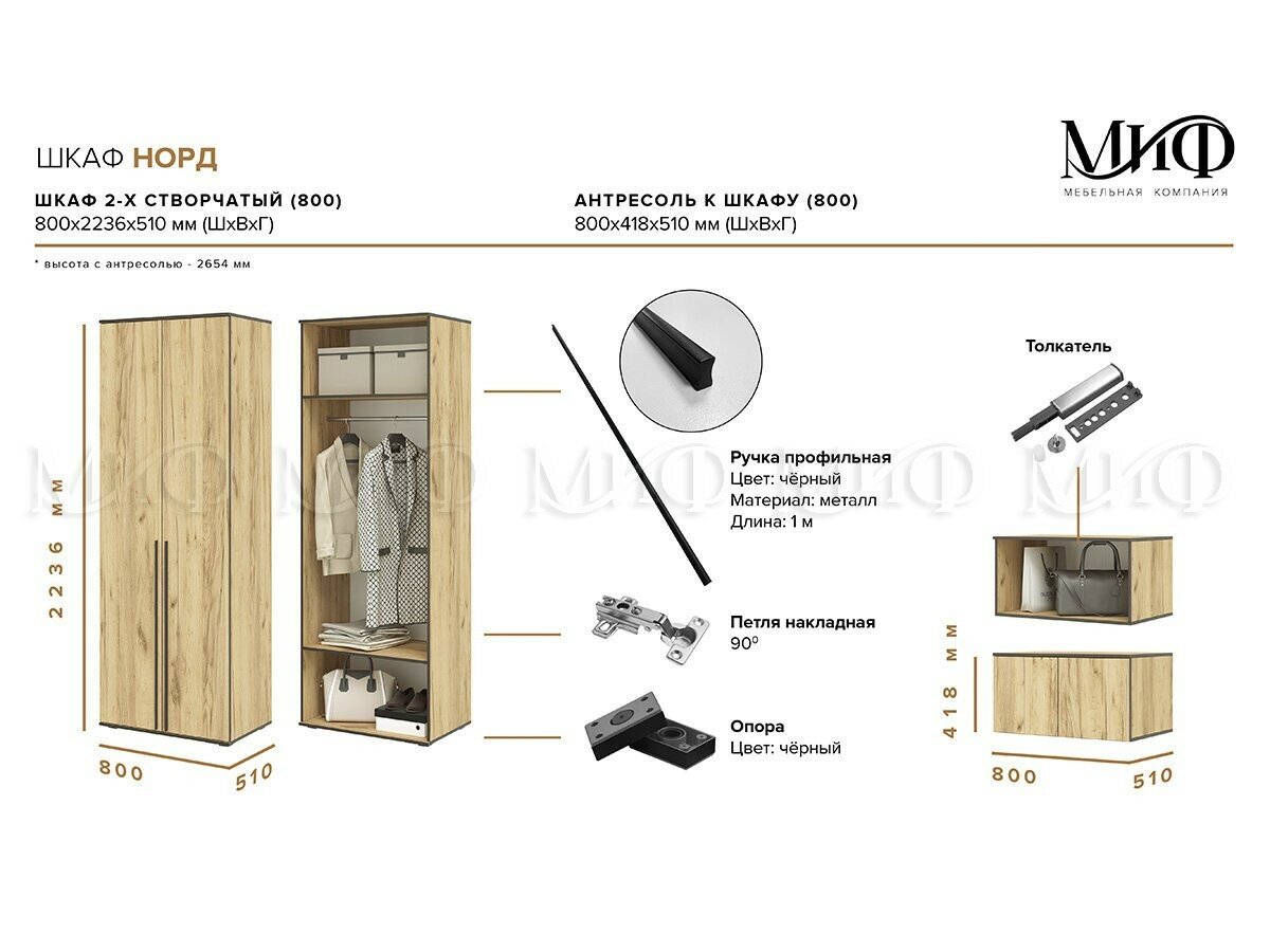 Высокий шкаф Миф Норд с антресолью, цвет Дуб Крафт, размер 800х510 h2654мм 13 928 ₽