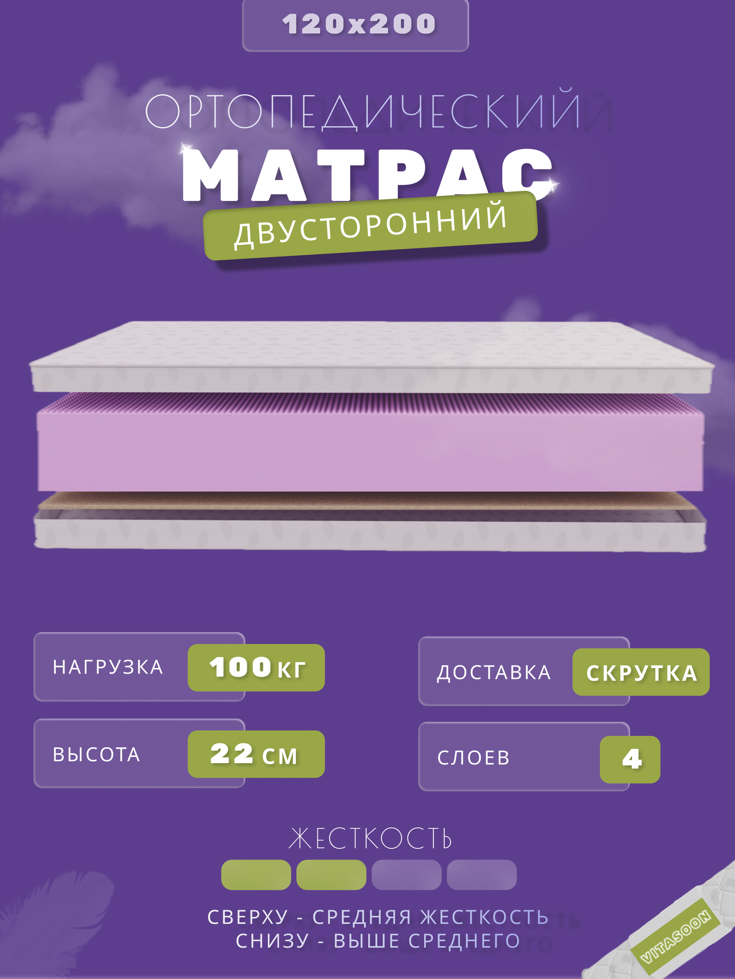 10 цен на Матрас беспружинный 120х200 см VitaSoon ComfortRoll 22 Ck, ортопедический, полуторный, с кокосом, ППУ, разная жесткость, в рулоне