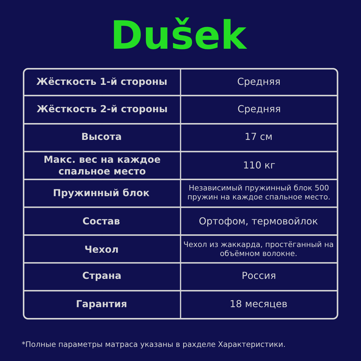 Двуспальный матрас 180х190 DUŠEK Memory S/M ортопедический эффект жёсткость мягкий/средний независимый пружинный блок 23 380 ₽
