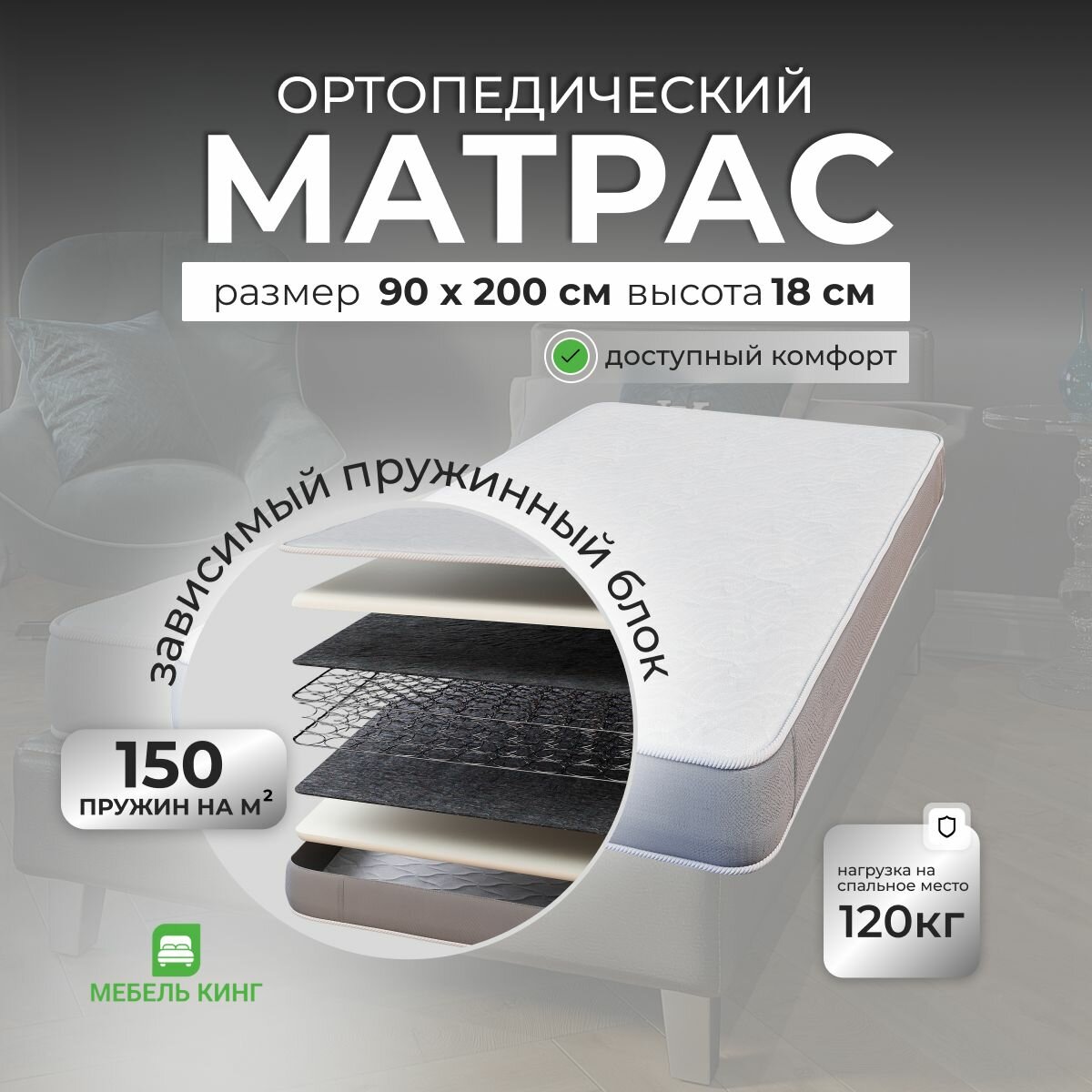 Матрас ортопедический с пеной Ortofoam, зависимые пружины, высота 18 см, 90х200 см 8 784 ₽
