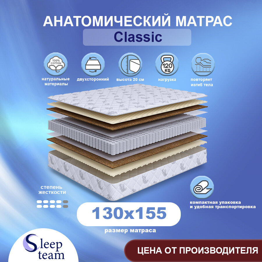 Матрас SleepTeam Classic 130х155, пружинный с массажным эффектом, высота 20 см, полутороспальный информация: