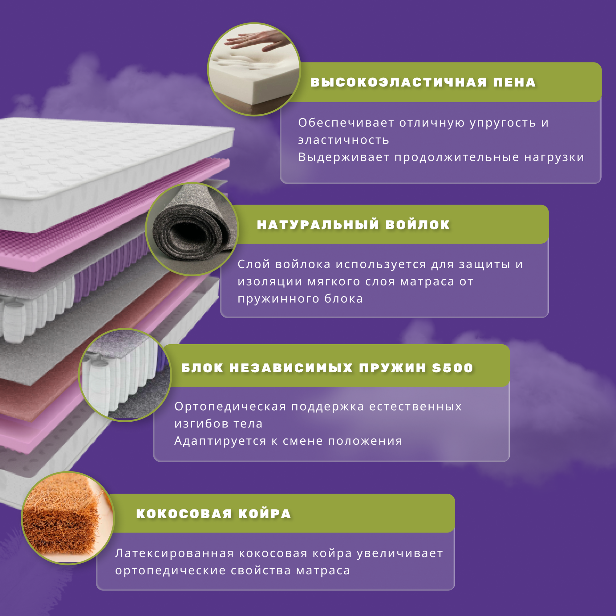 Фабрика Сна Матрас EDMOND, независимые пружины, кокос, средняя жесткость, анатомический, 90х200 см