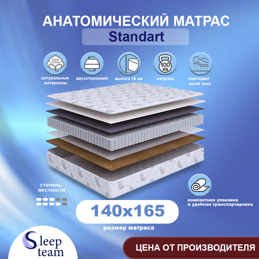 Матрас пружинный SleepTeam Standart 140х165, с независимыми пружинами, высота 20 см, полутороспальный информация:
