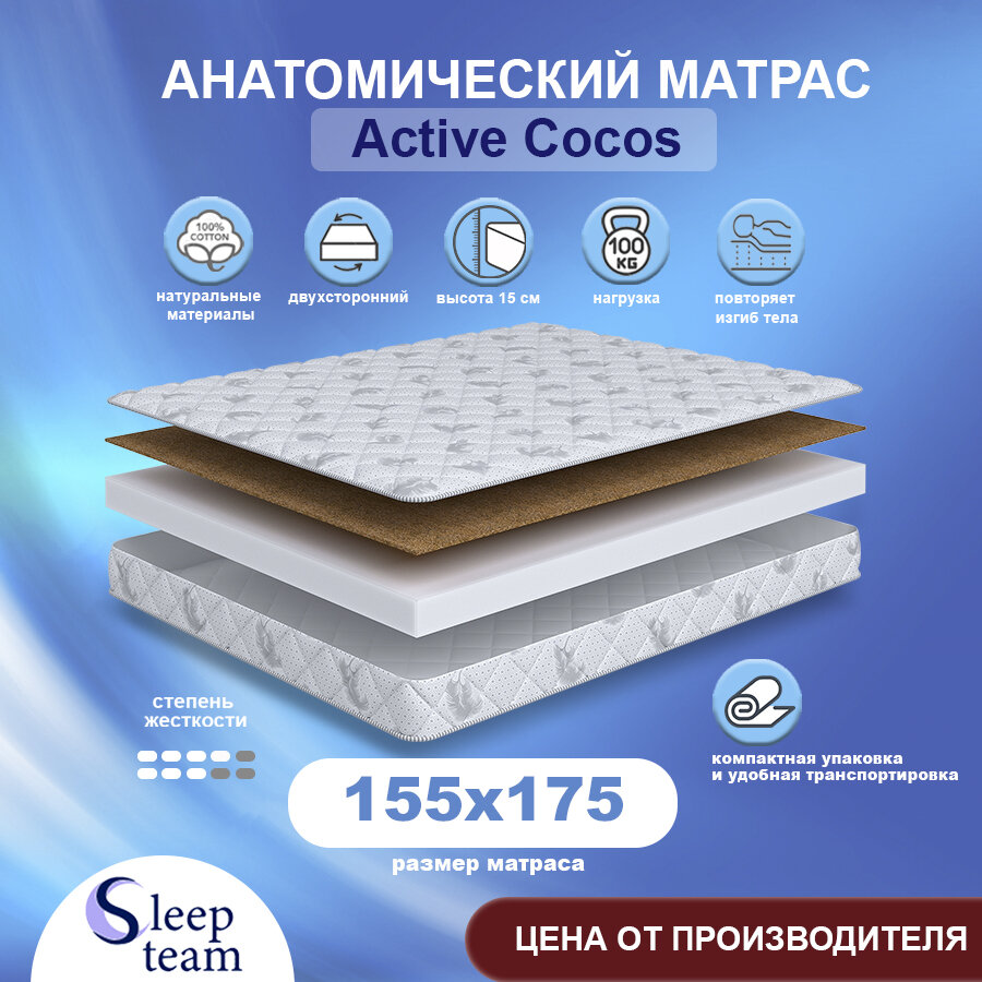 Матрас SleepTeam Active Cocos 155х170, беспружинный, для кровати, высота 15 см, двуспальный 15 181 ₽