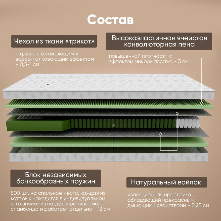 Фабрика Сна Матрас EDMOND, независимые пружины, кокос, средняя жесткость, анатомический, 90х200 см