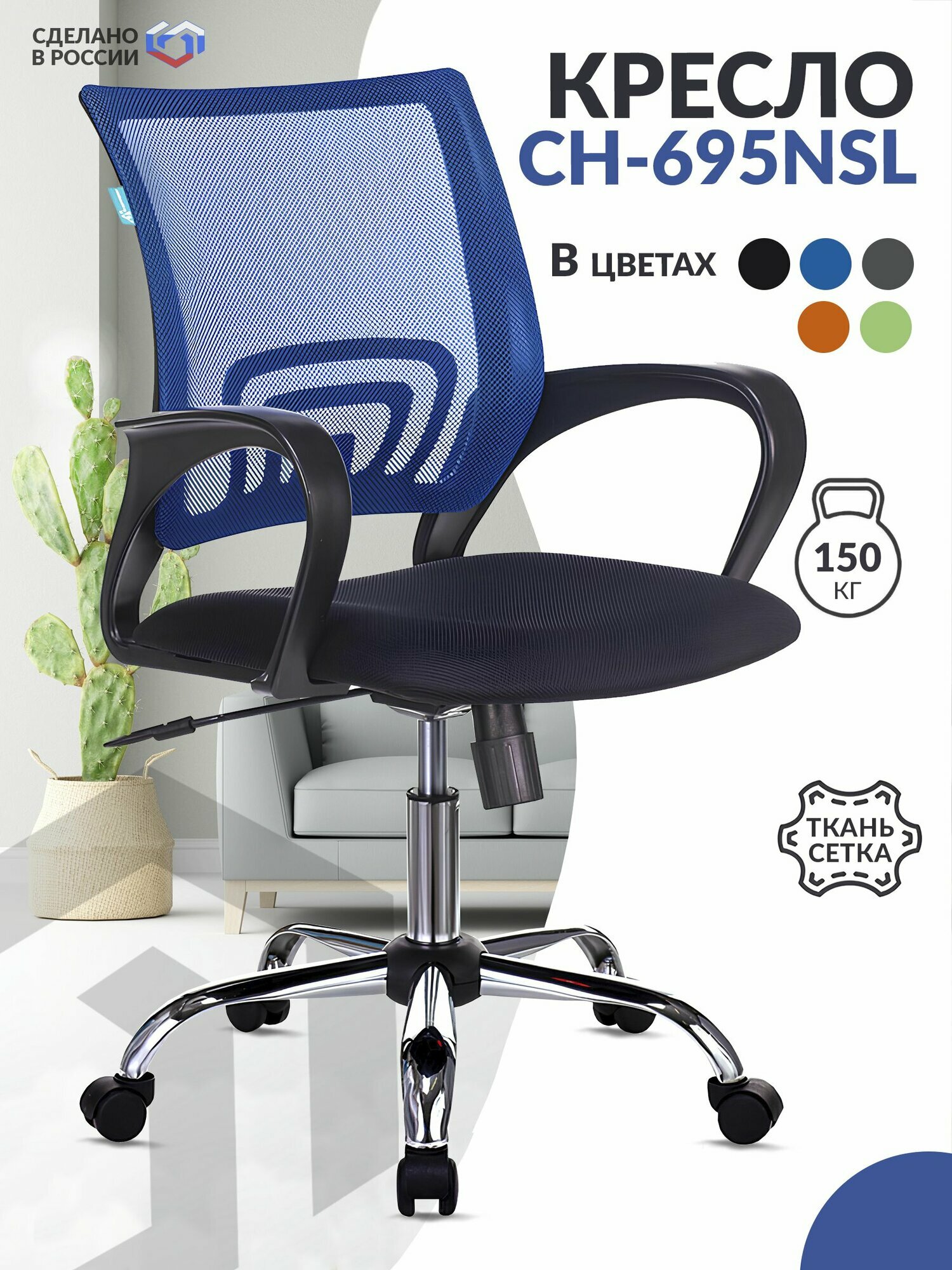 Кресло компьютерное CH-695NSL синий, сетка, ткань / Кресло для оператора, школьника, ребенка, офисное