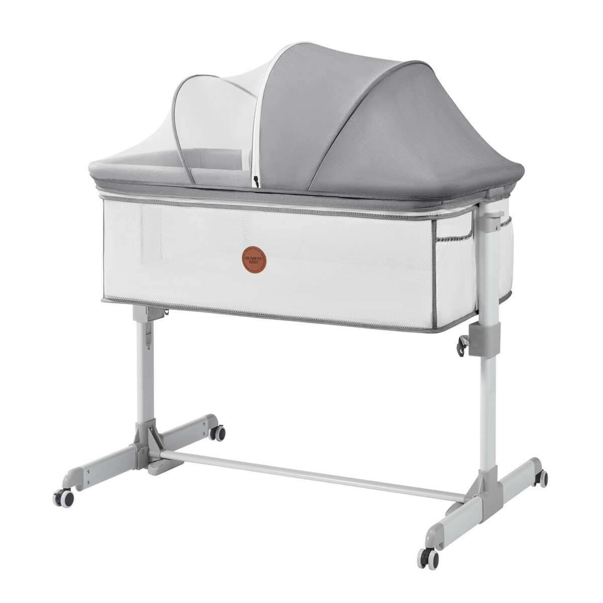 Кроватка детская для новорожденного Dearest приставная с матрасом, с москитной сеткой, с маятником, серый информация:
