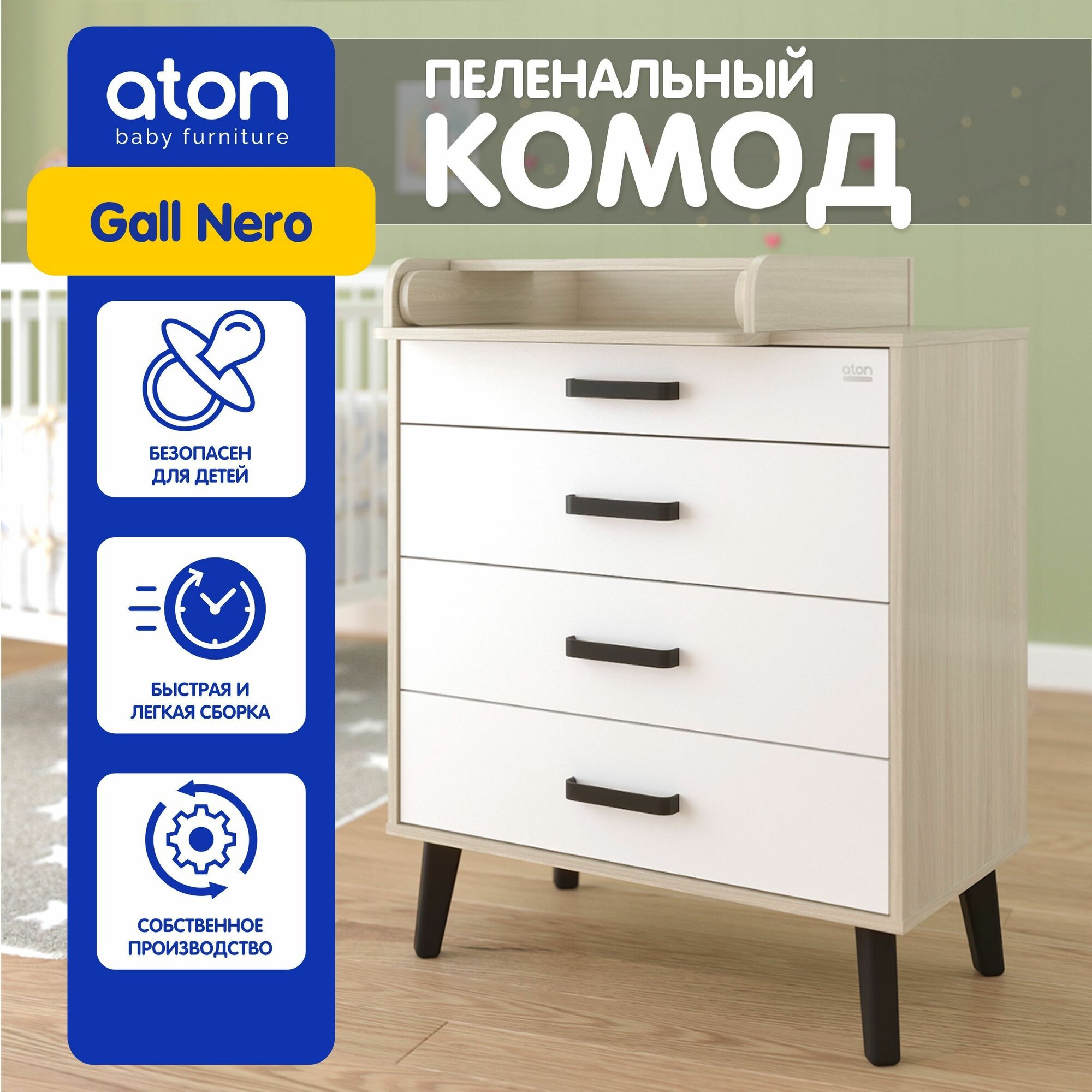 Комод для новорожденных Gall Nero, шимо светлый/белый/черные ножки, Aton, со съёмным пеленальным столиком, 102х80х56 см информация: