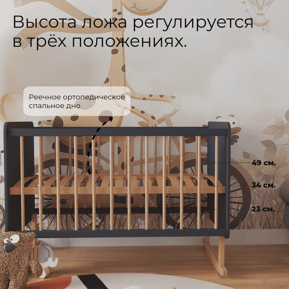 Кроватка ONESTA W&B для новорожденных, приставная, маятник и матрас в комплекте, берёза/МДФ, графит 20 990 ₽