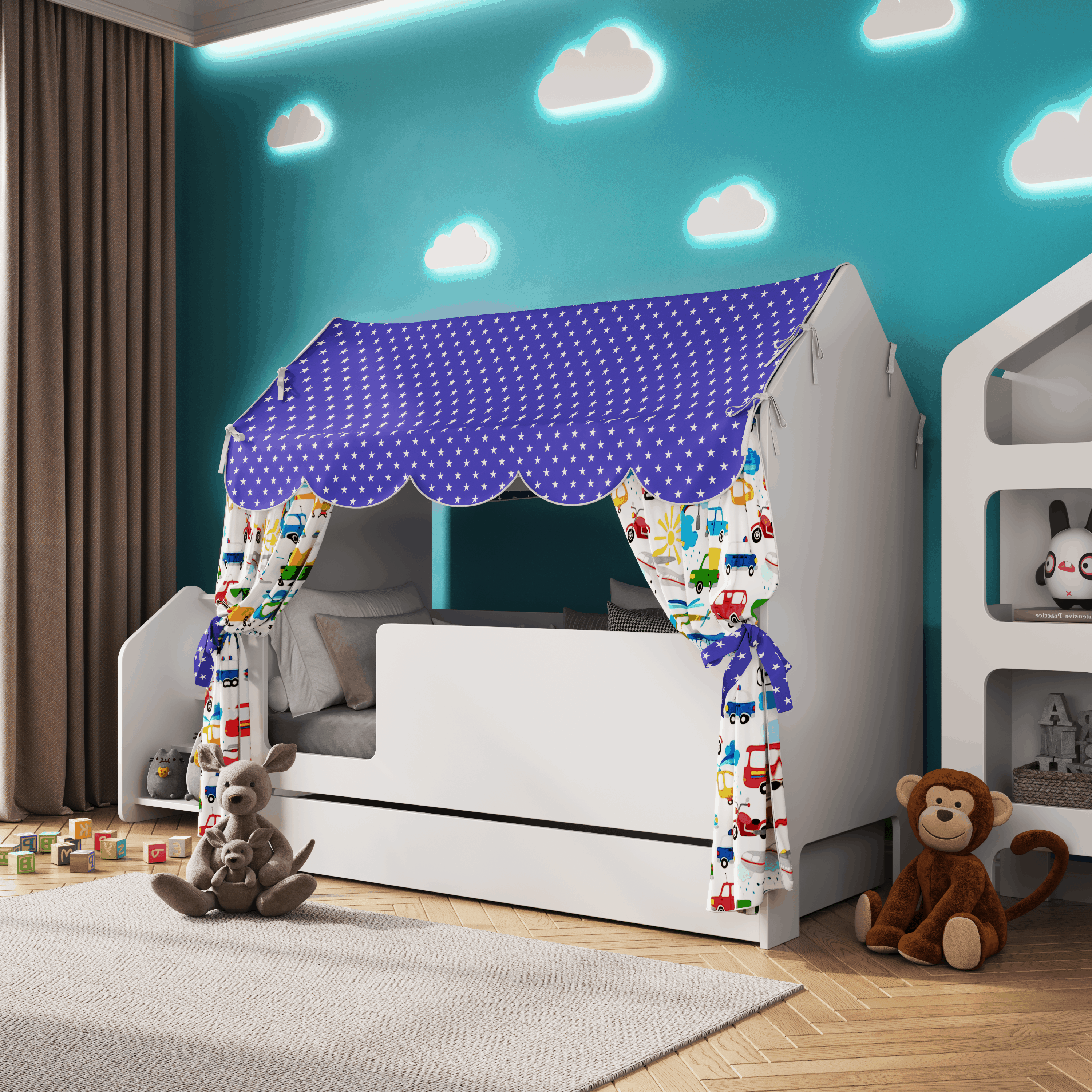 10 цен на Кроватка детская домик с текстилем и ящиком" (балдахин- синий, с машинками, выкатной ящик / ящик для хранения белья, игрушек ), "Базовый", вход слева