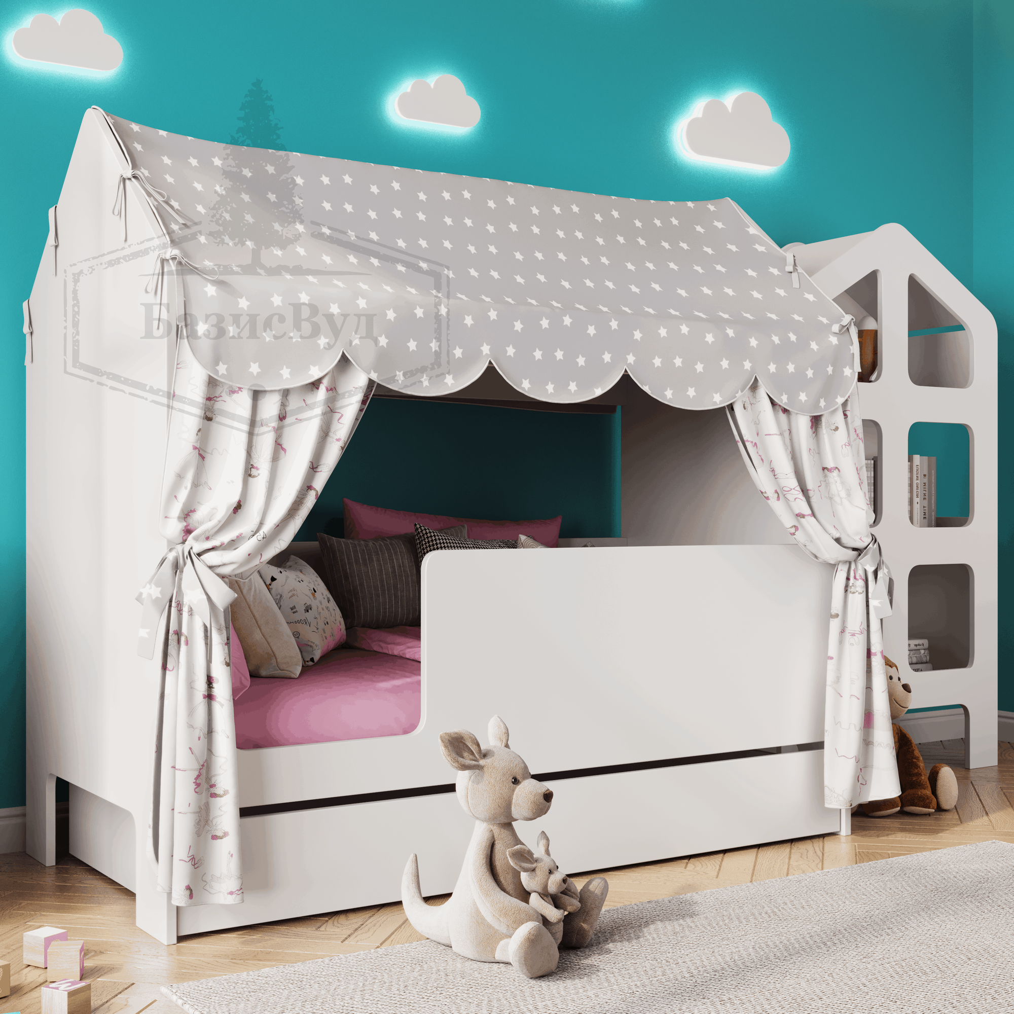 10 цен на Кроватка детская домик с текстилем и ящиком (серый, с принцессами, вход слева) "Базовый"