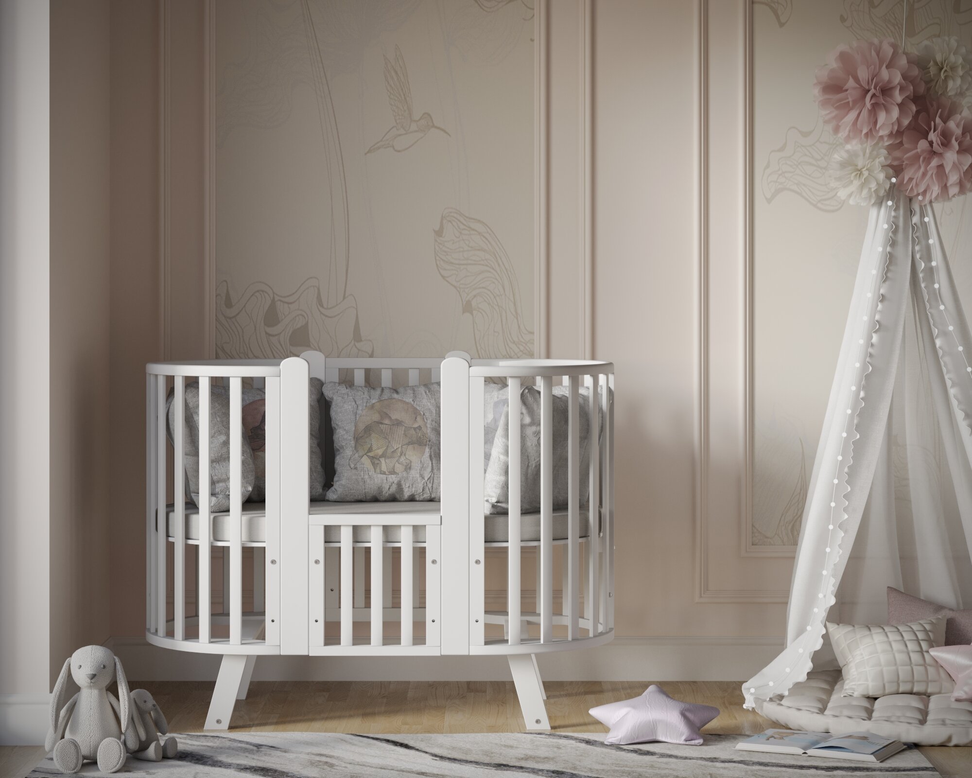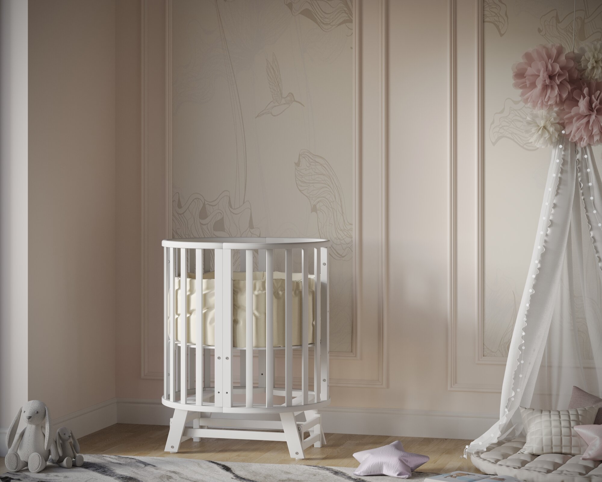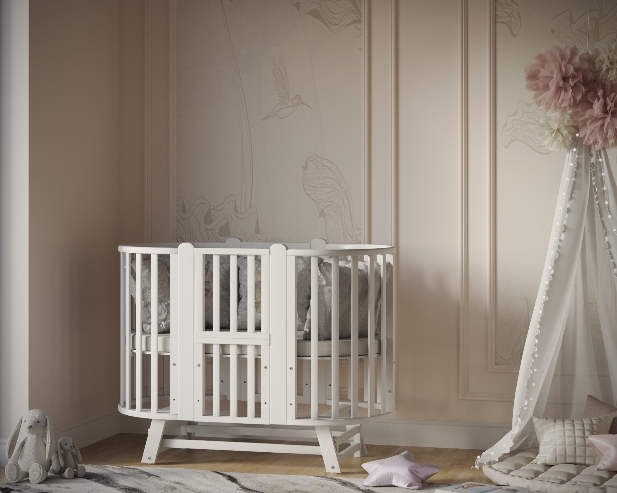 Кроватка детская трансформер для новорожденного Indigo Омега 6 в 1 с поперечным маятником, массив березы, белый