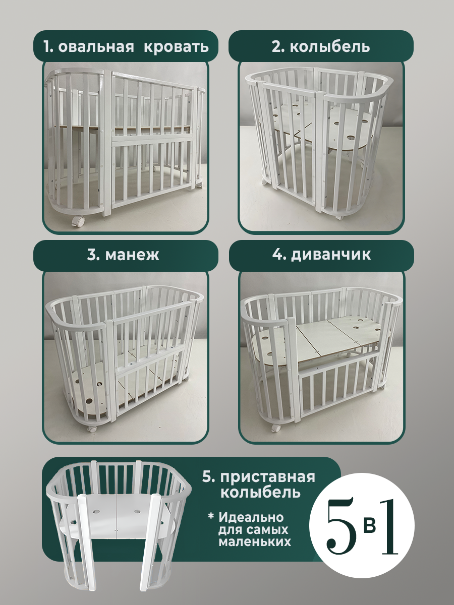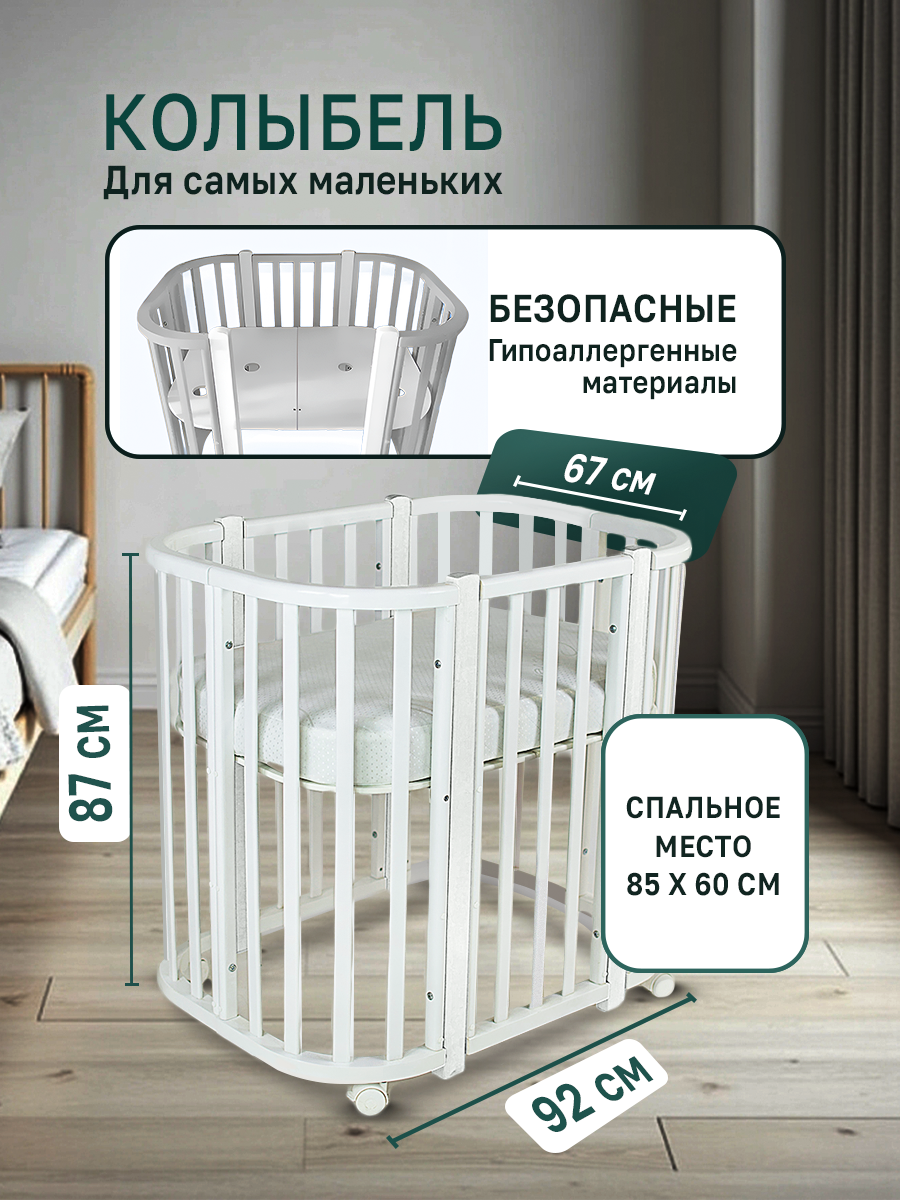 Азбука Кроваток, Детская кровать трансформер для новорожденных 5в1 Santorini, белый, 85х60, 120х60, на колесах информация: