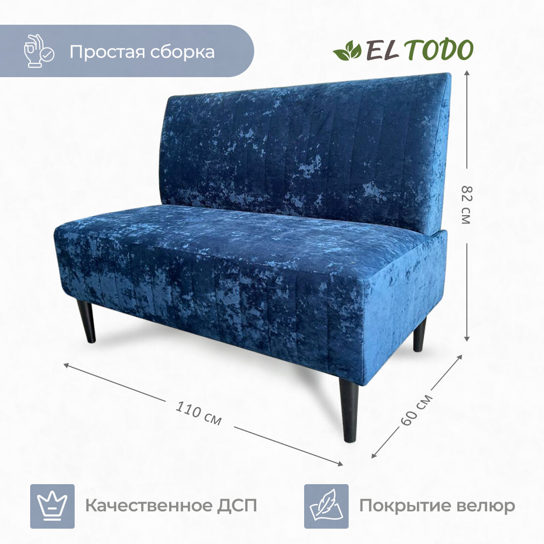 Отзывы на Прямой диван EL TODO монро, на кухню, на балкон, в прихожую, велюр, синий,110х60х82 см