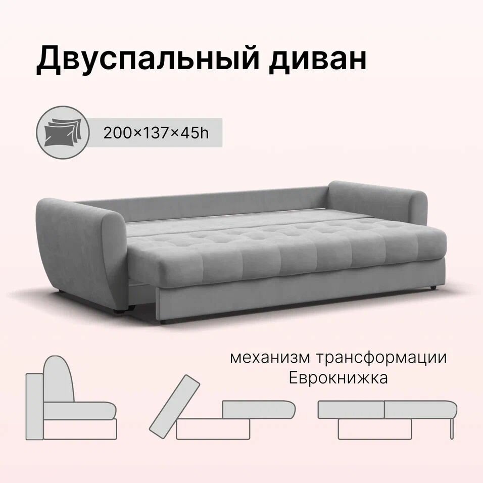 Диван-кровать Престон 2.0, с ящиком для хранения, еврокнижка, велюр Monolit сталь, 235х104х93 см информация: