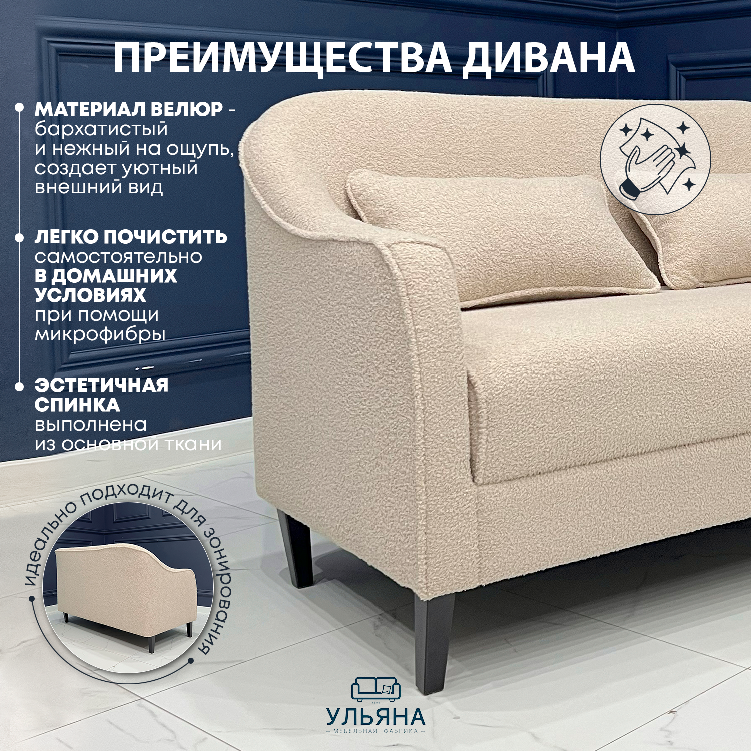 МФ Ульяна Диван Зиппи бежевый букле декоративными подушками для дома информация: