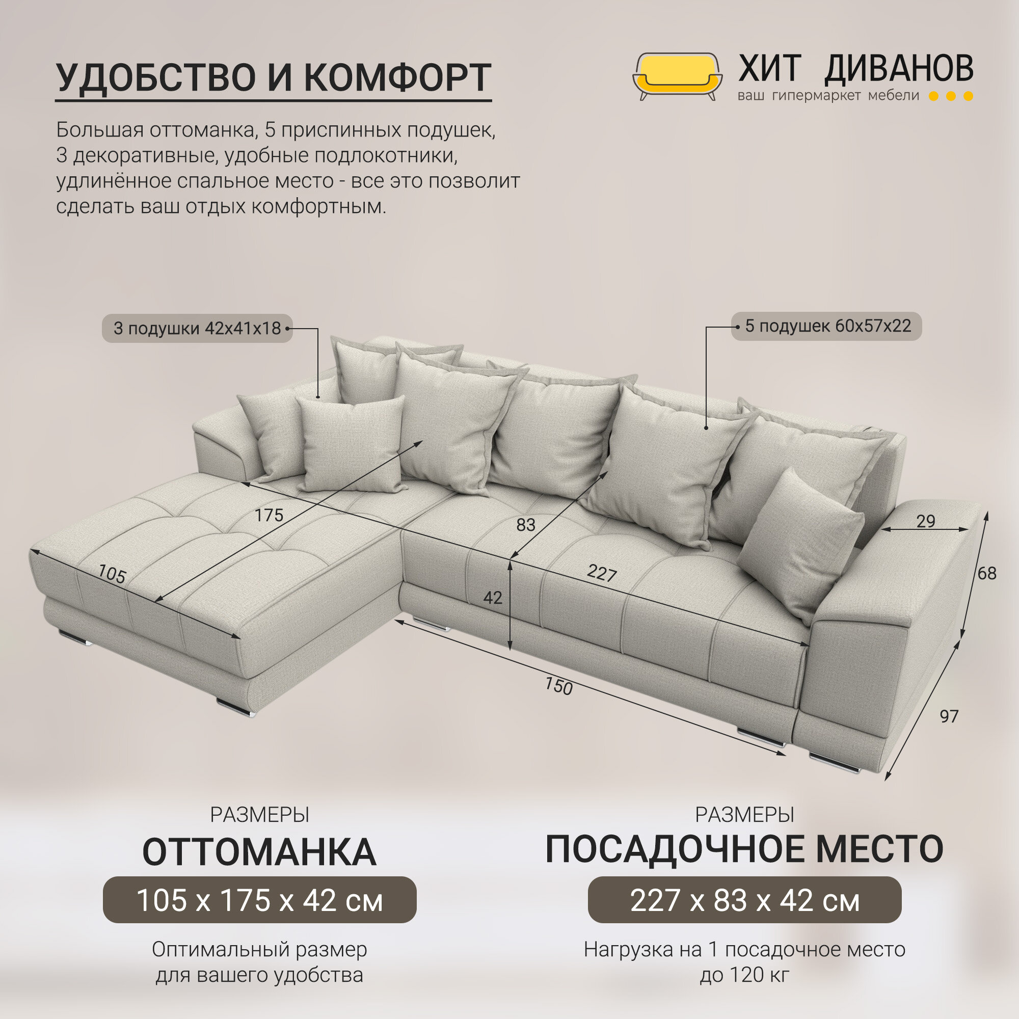 Диван угловой НордСтар левый угол, рогожка, механизм еврокнижка, Амур бежевый, 284x190x93см. Хит Диванов информация: