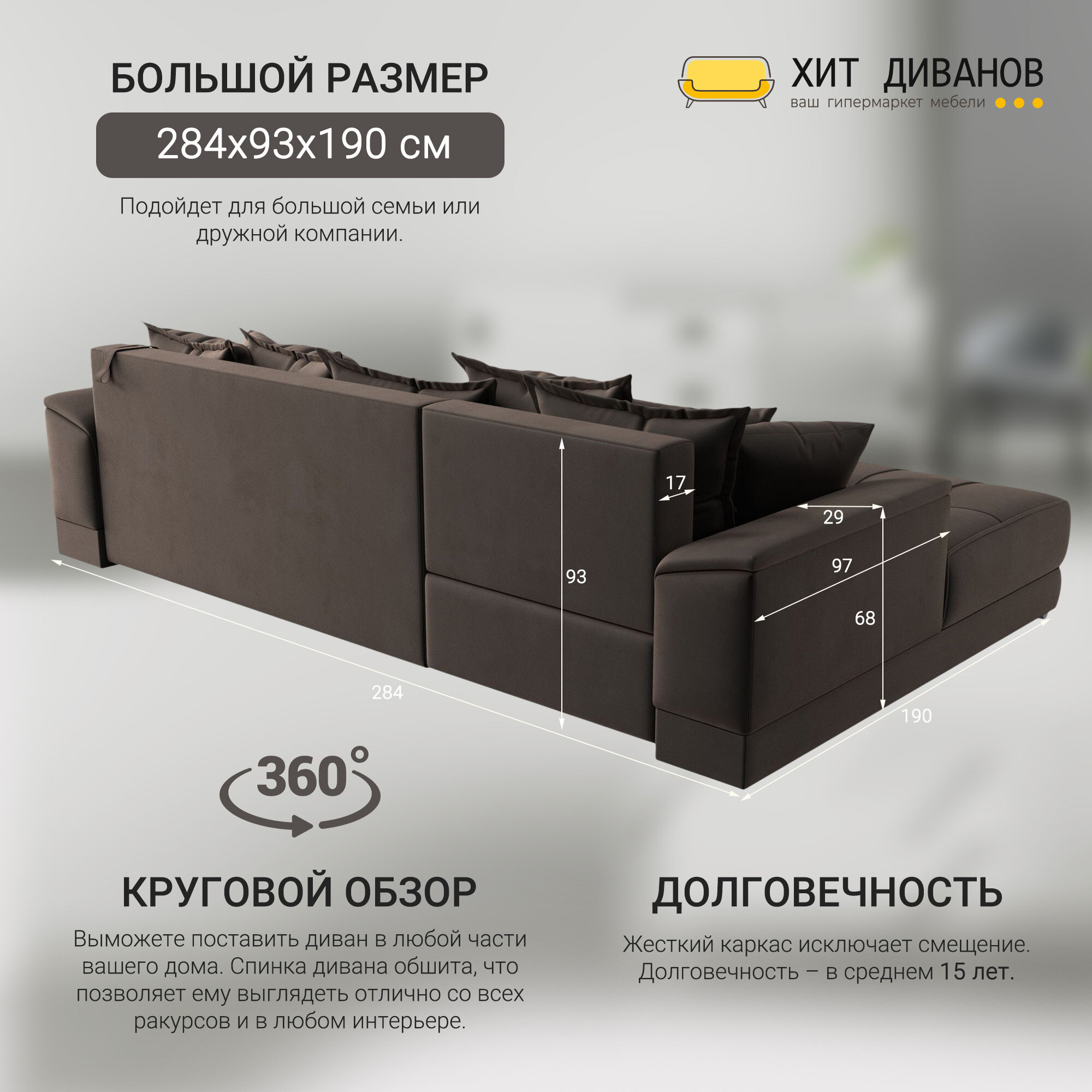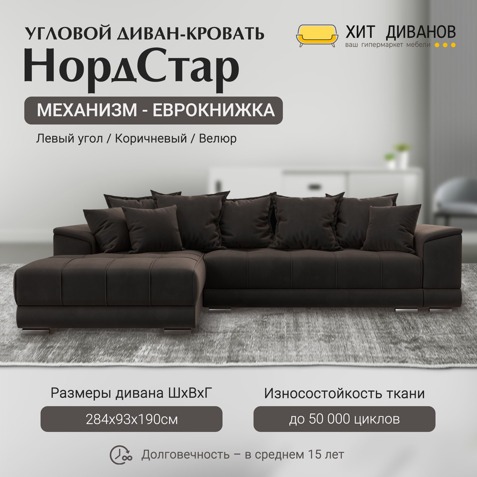 Диван угловой НордСтар левый угол, велюр, механизм еврокнижка, коричневый, 284x190x93см. Хит Диванов информация: