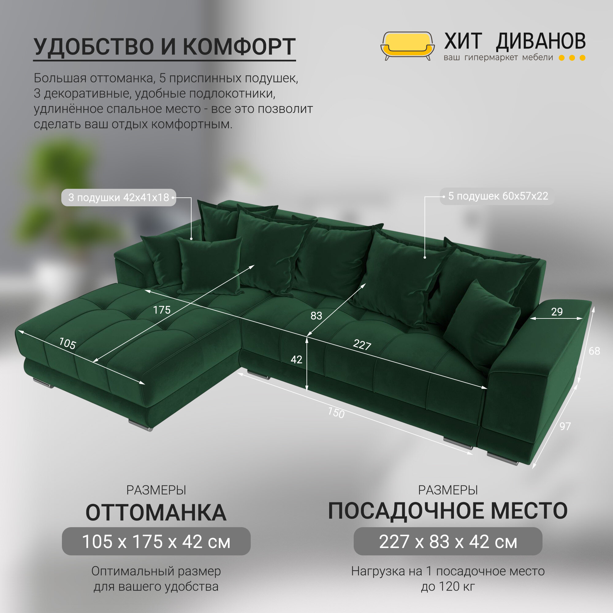 Диван угловой НордСтар левый угол, велюр, механизм еврокнижка, зеленый, 284x190x93см. Хит Диванов информация:
