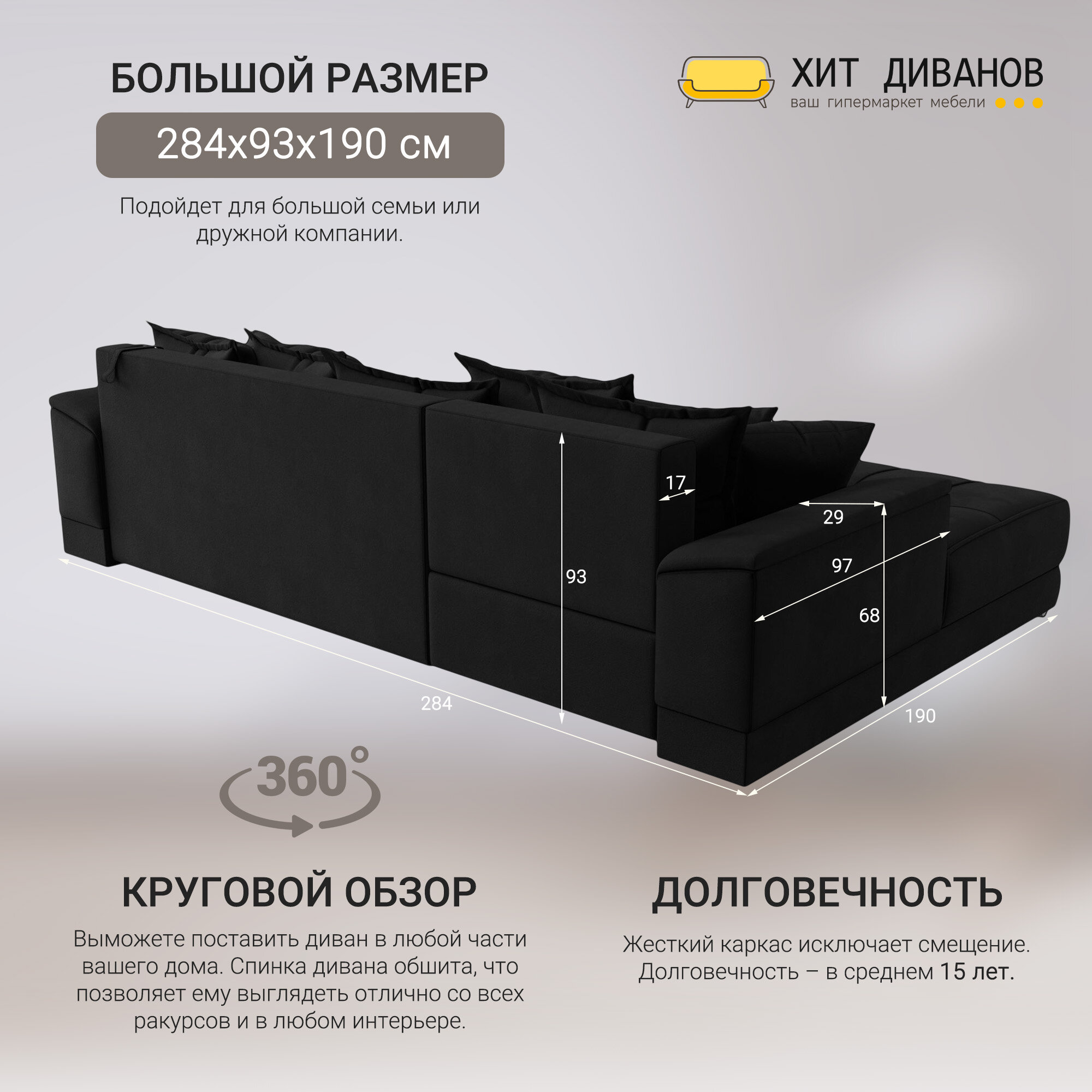 Диван угловой НордСтар левый угол, микровельвет, механизм еврокнижка, черный, 284x190x93см. Хит Диванов информация: