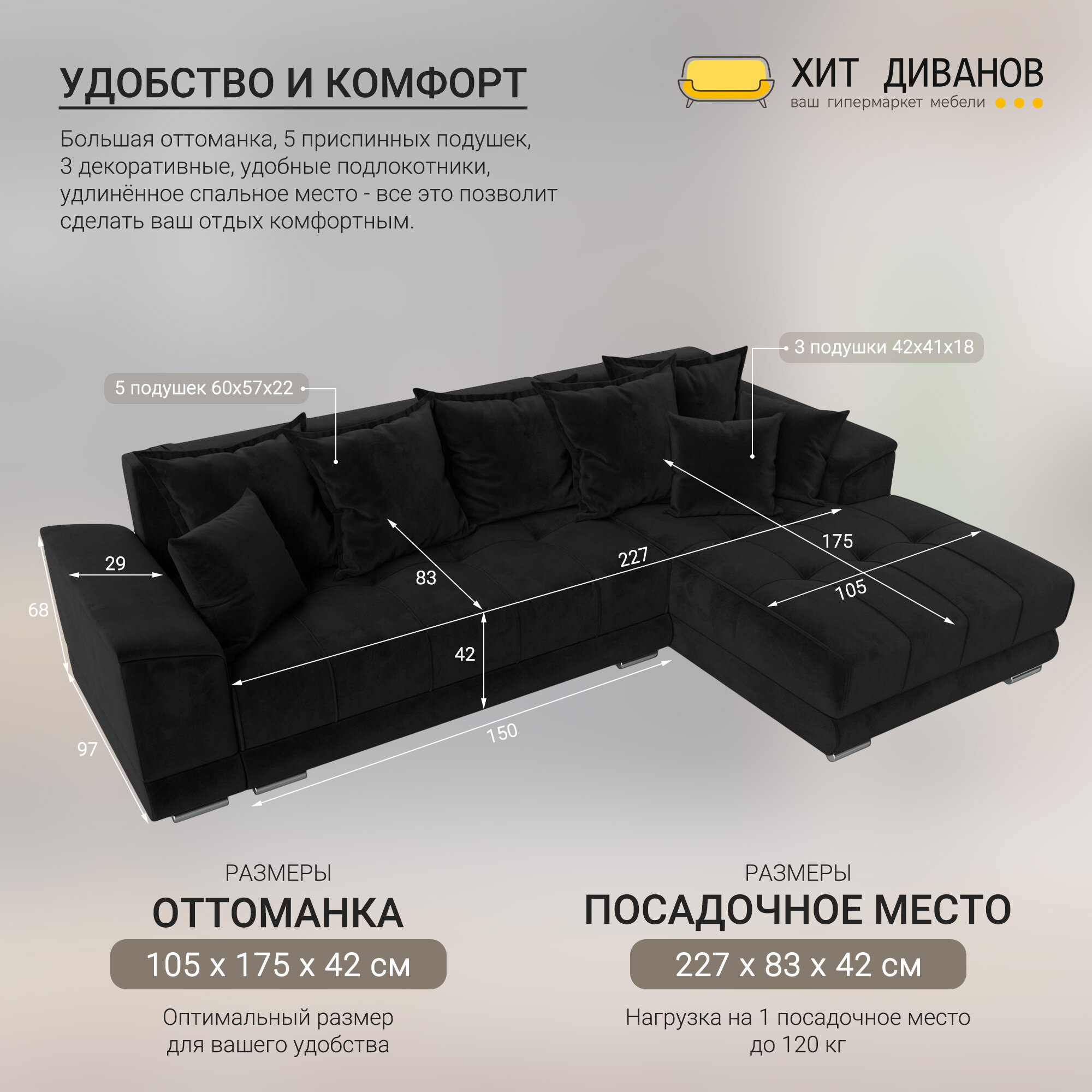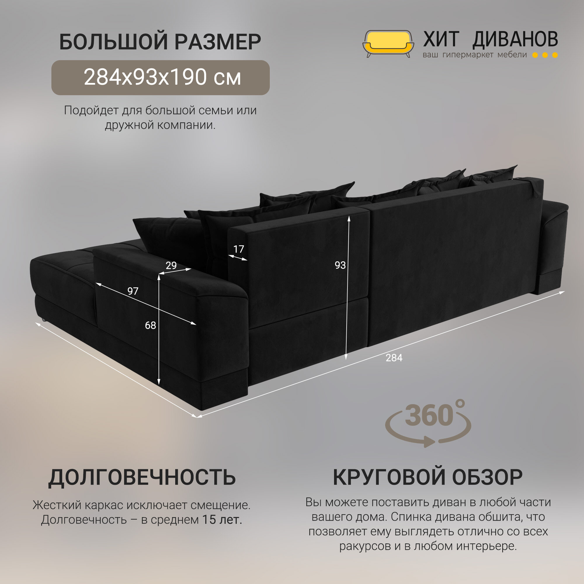 Диван угловой НордСтар правый угол, велюр, механизм еврокнижка, черный, 284x190x93см. Хит Диванов информация: